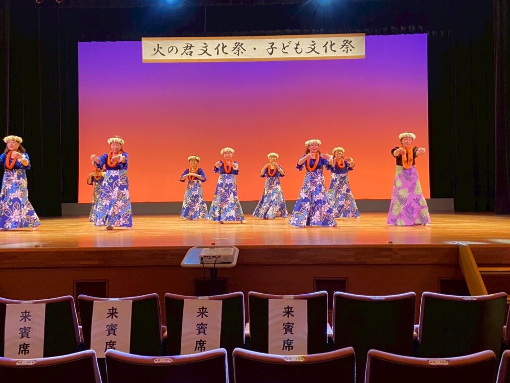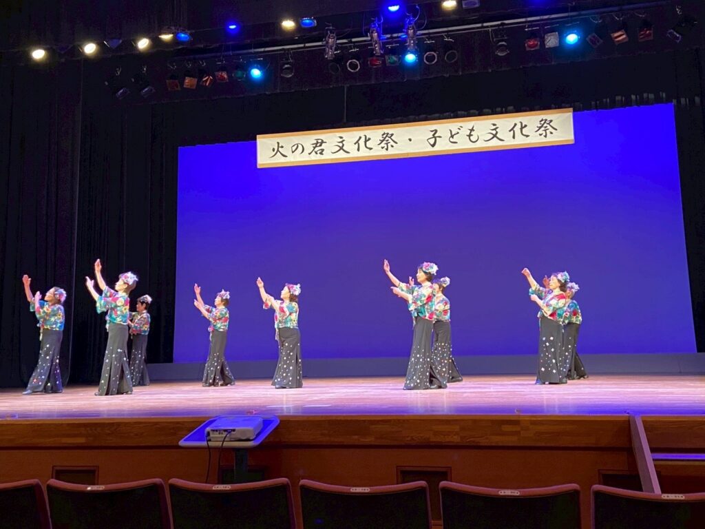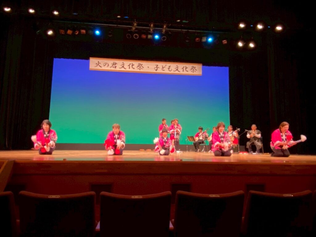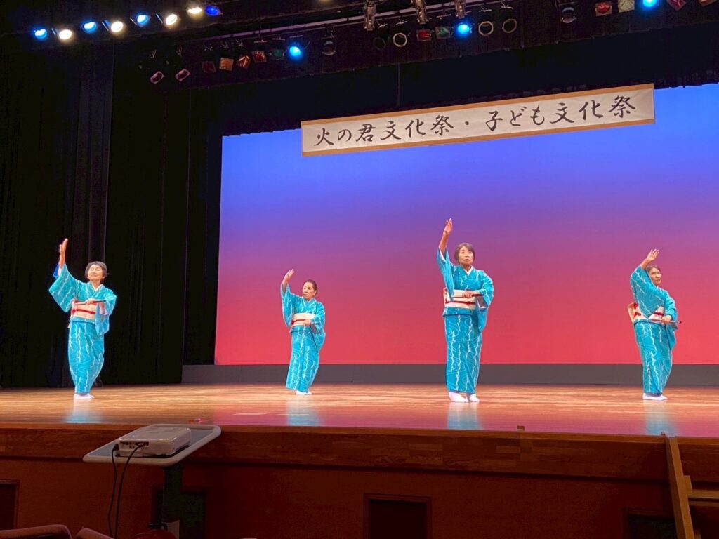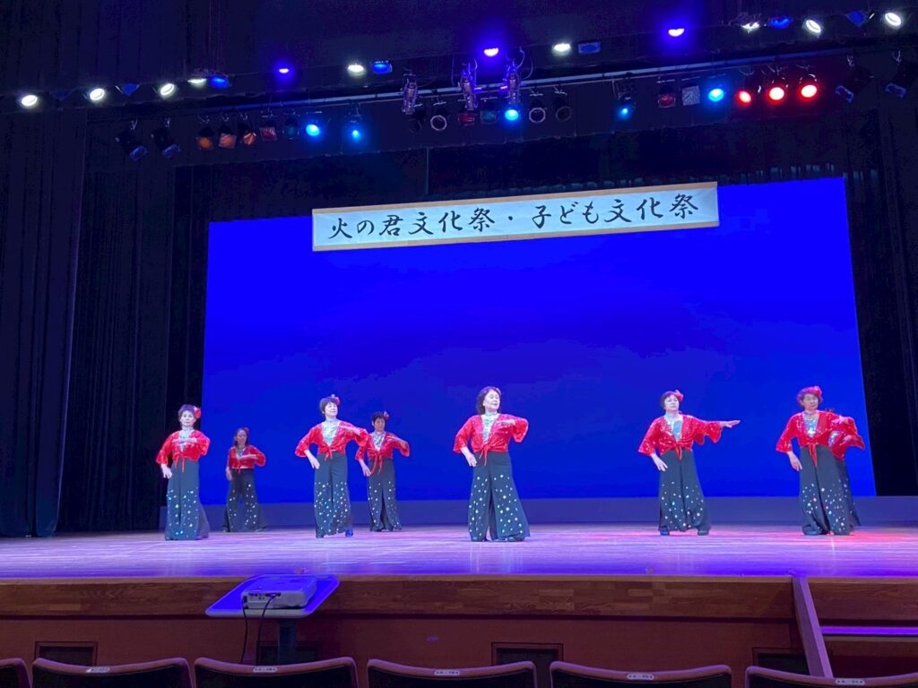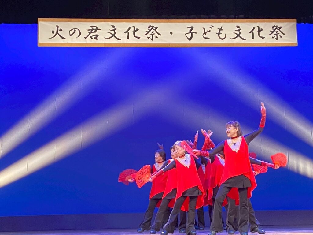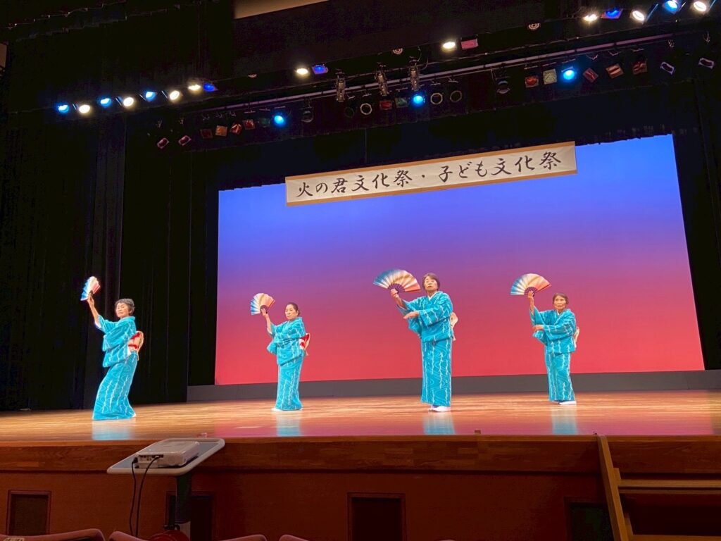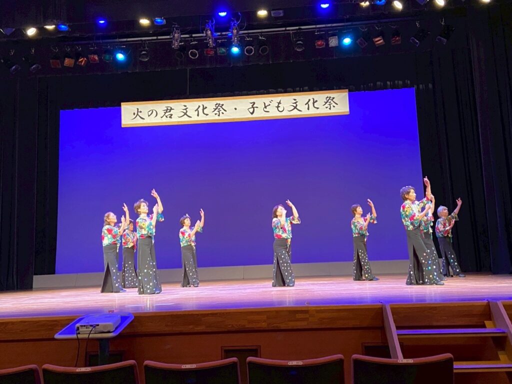 ステージ発表では、子ども文化祭として、保育園、こども園、幼稚園、小学校の園児・児童による合唱・器楽演奏・日舞・ダンスなど、火の君文化祭として、フラダンス・合唱・ギター・ウクレレ・フルート・ハーモニカ・大正琴・レクダンス・民謡・日舞・尺八・オカリナ・民話・創作ダンス・吟詠・サックスなど合計48組のパフォーマンスがありました。