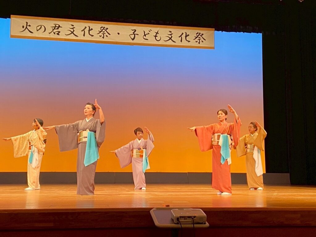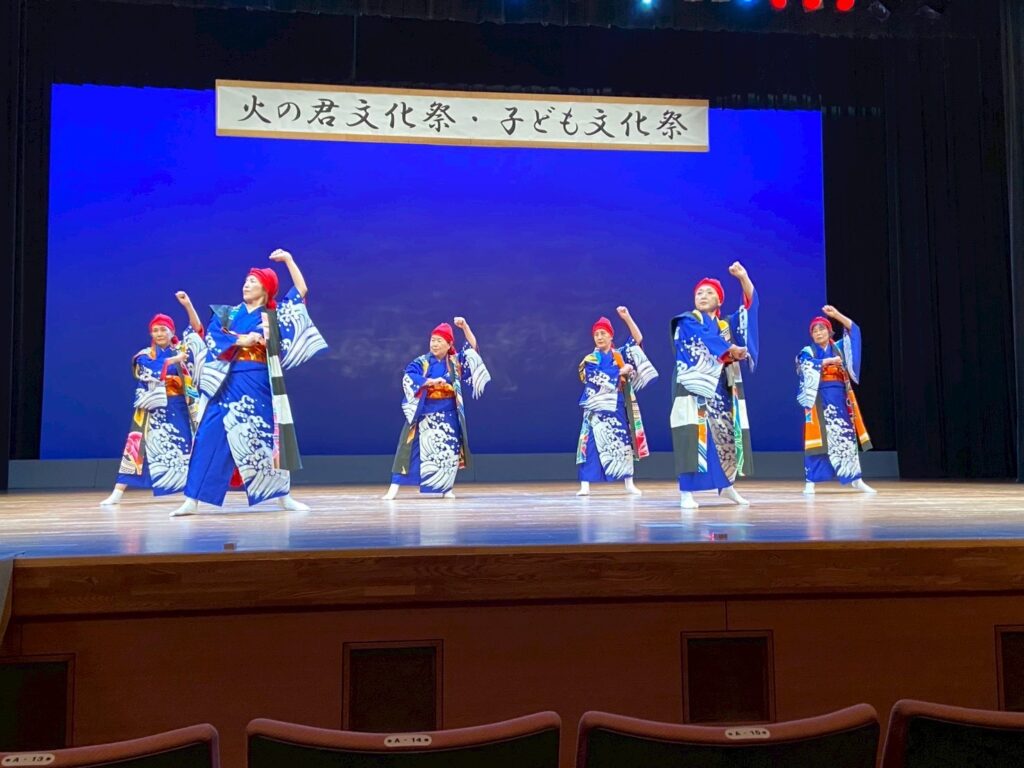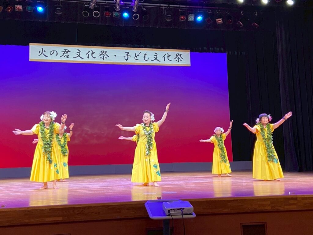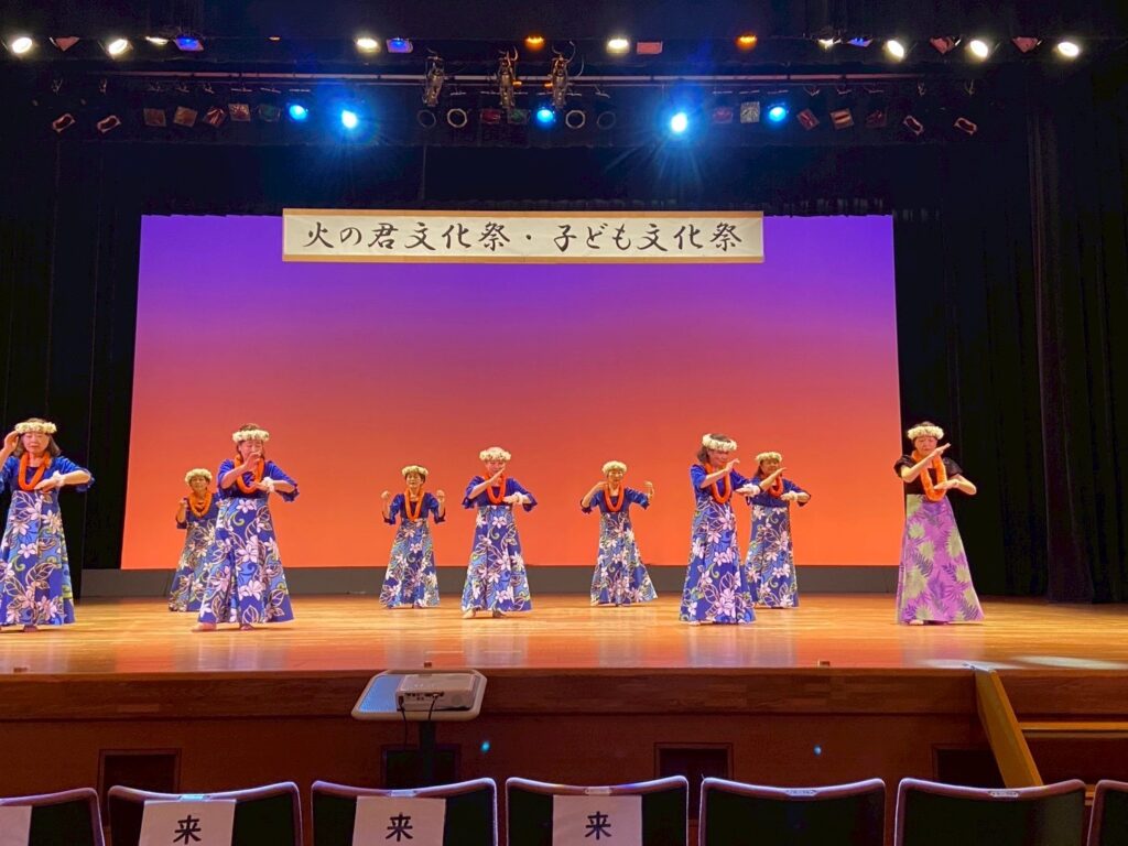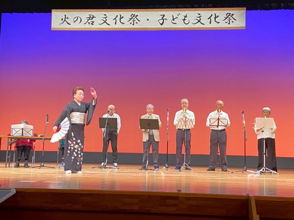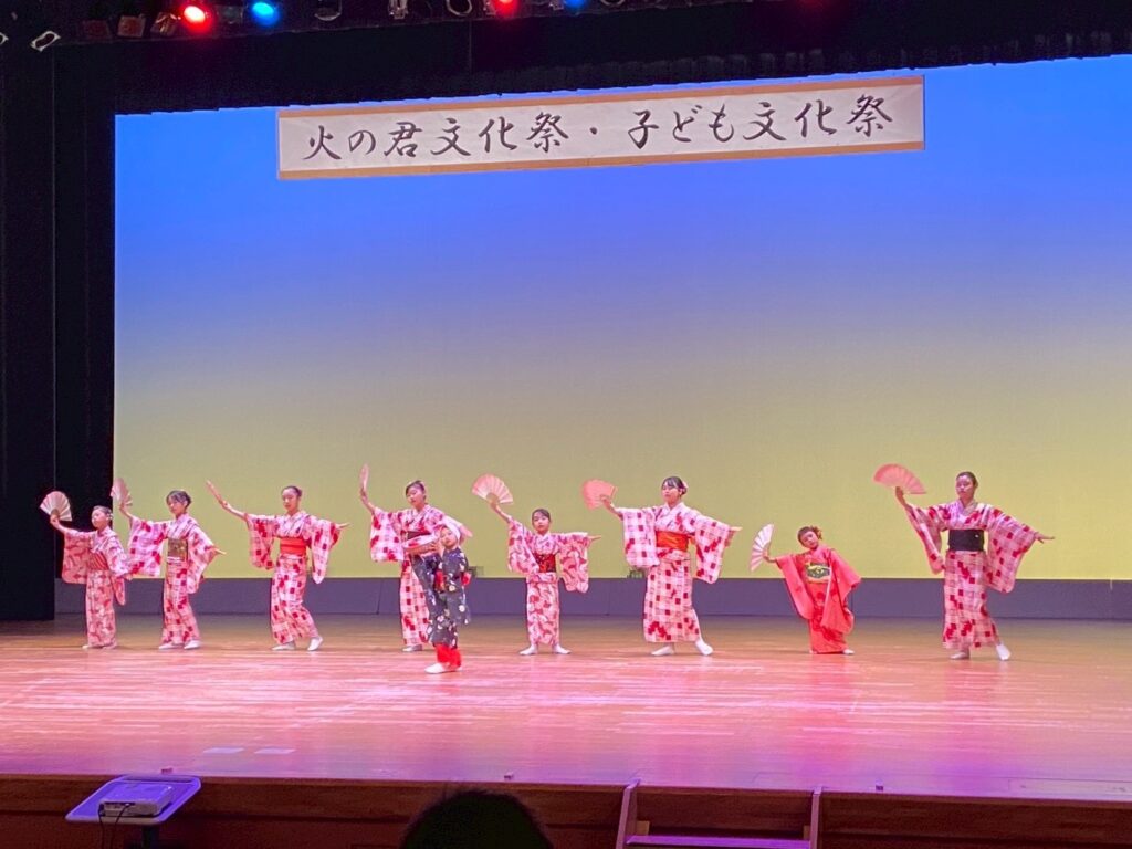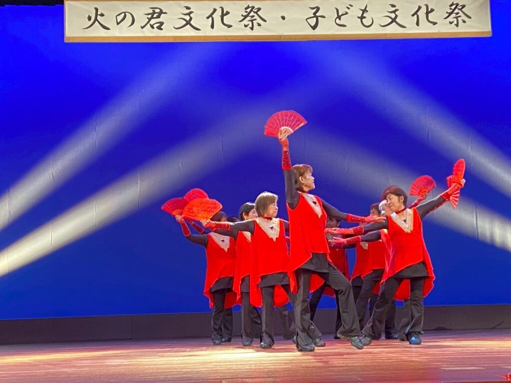 ステージ発表では、子ども文化祭として、保育園、こども園、幼稚園、小学校の園児・児童による合唱・器楽演奏・日舞・ダンスなど、火の君文化祭として、フラダンス・合唱・ギター・ウクレレ・フルート・ハーモニカ・大正琴・レクダンス・民謡・日舞・尺八・オカリナ・民話・創作ダンス・吟詠・サックスなど合計48組のパフォーマンスがありました。
