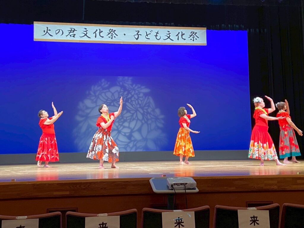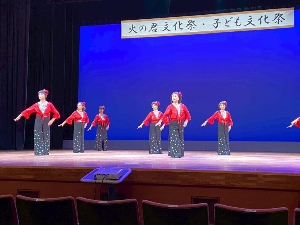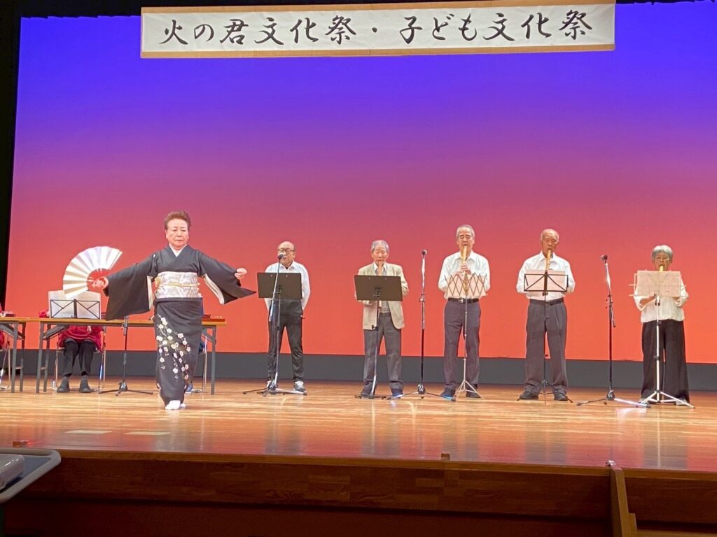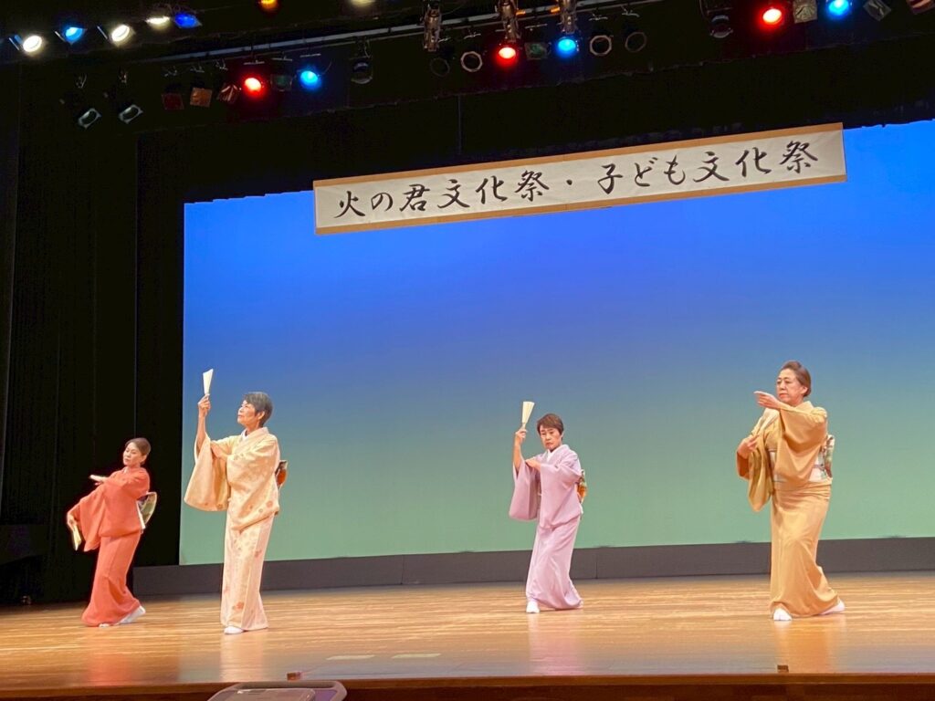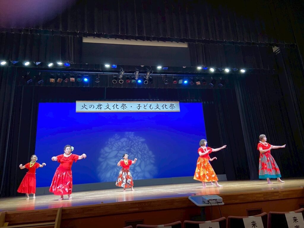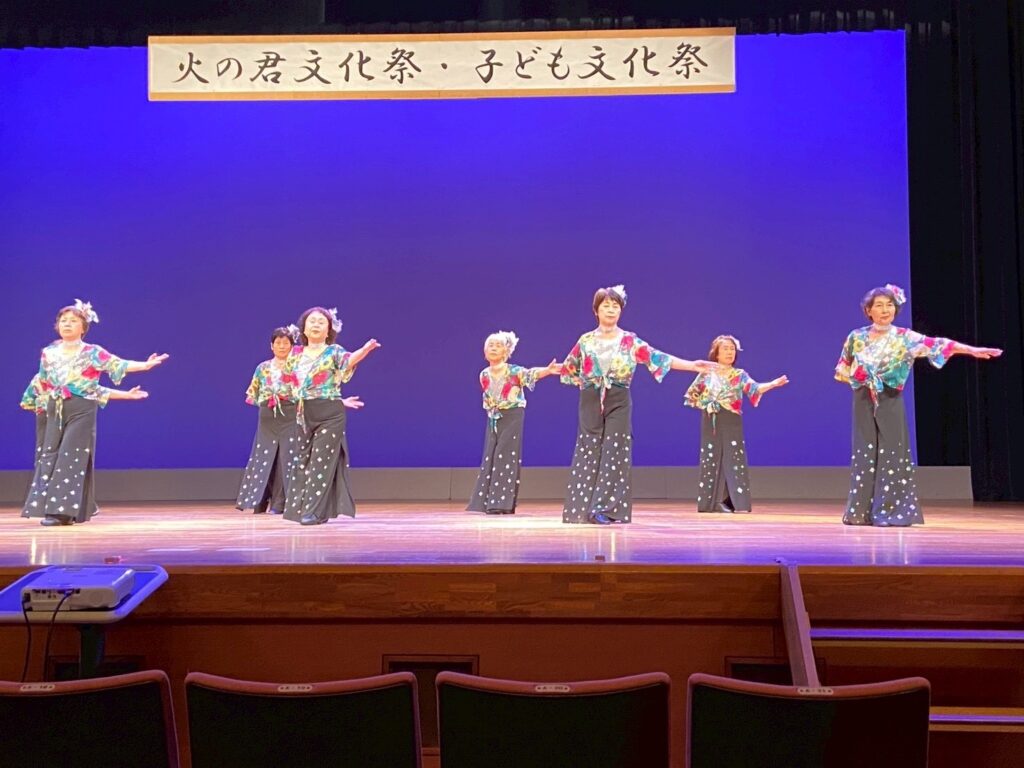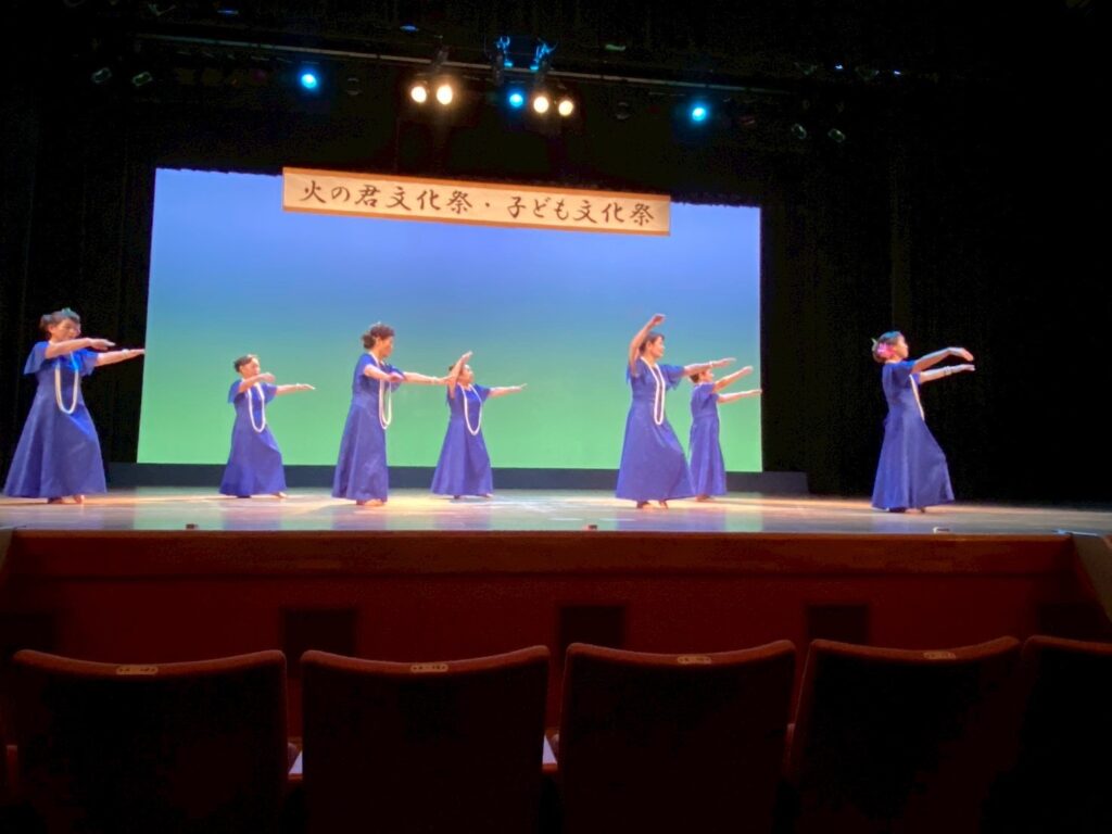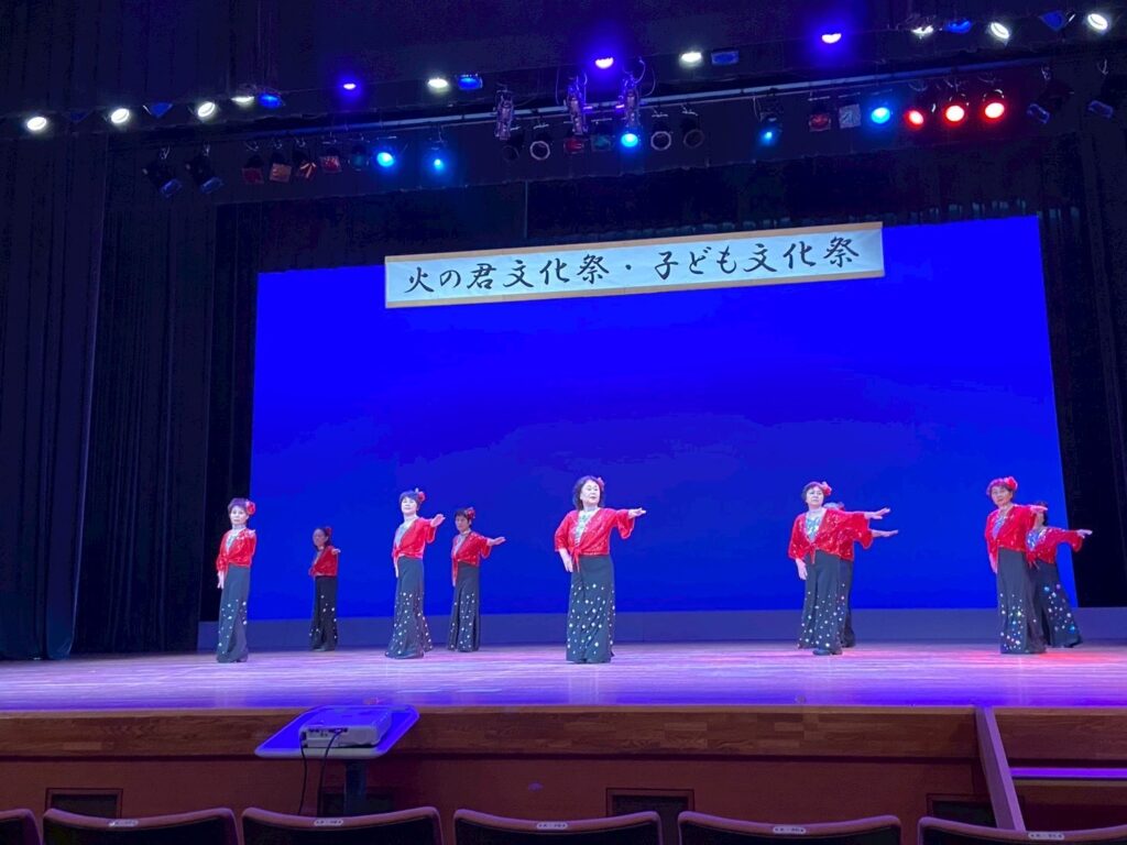 ステージ発表では、子ども文化祭として、保育園、こども園、幼稚園、小学校の園児・児童による合唱・器楽演奏・日舞・ダンスなど、火の君文化祭として、フラダンス・合唱・ギター・ウクレレ・フルート・ハーモニカ・大正琴・レクダンス・民謡・日舞・尺八・オカリナ・民話・創作ダンス・吟詠・サックスなど合計48組のパフォーマンスがありました。
