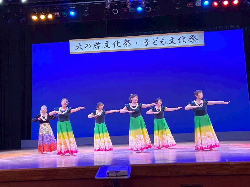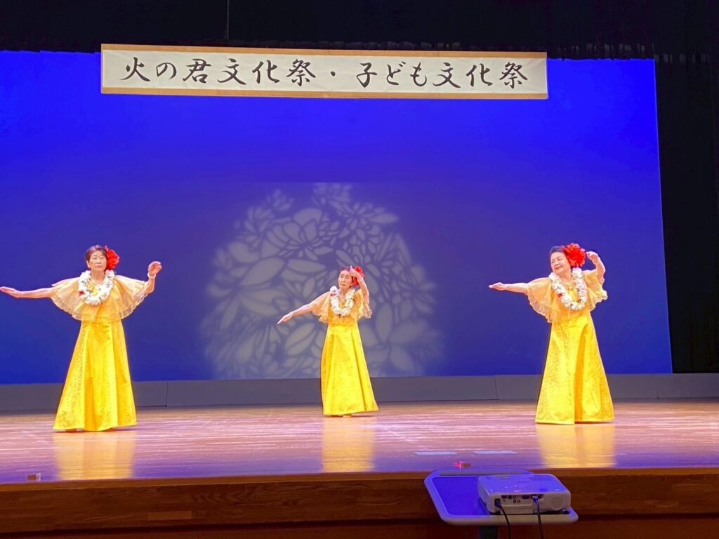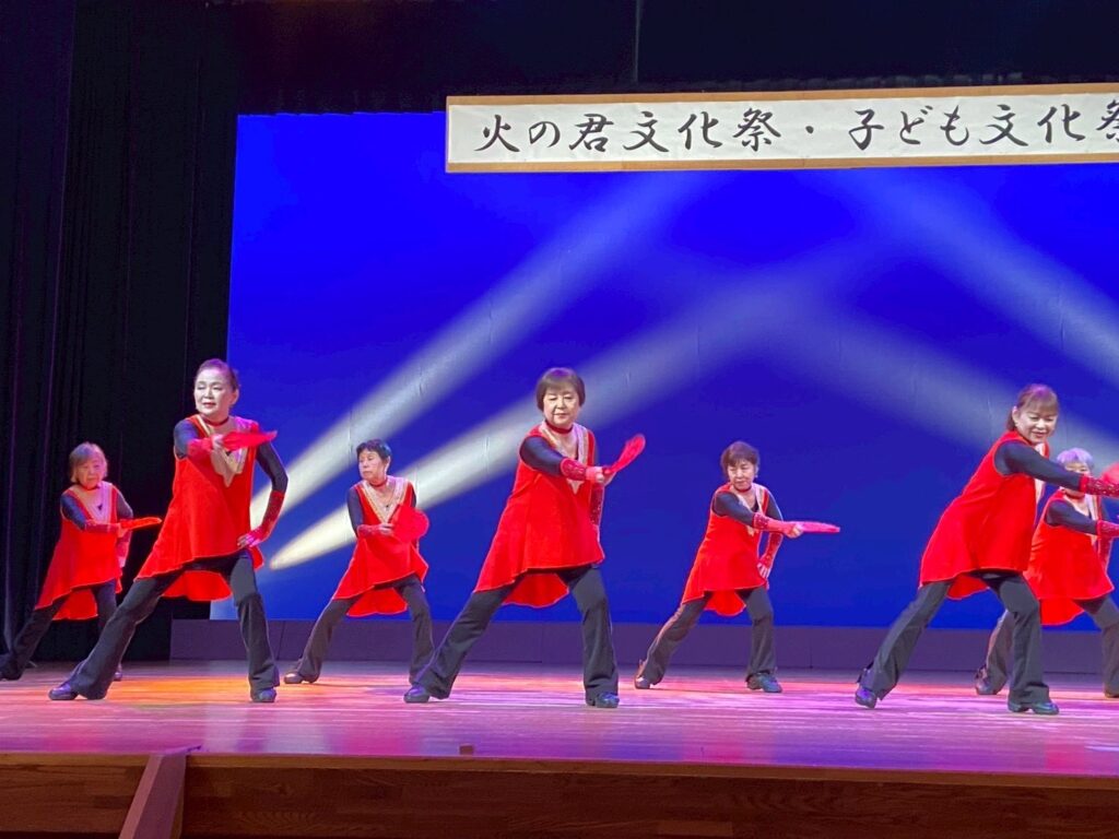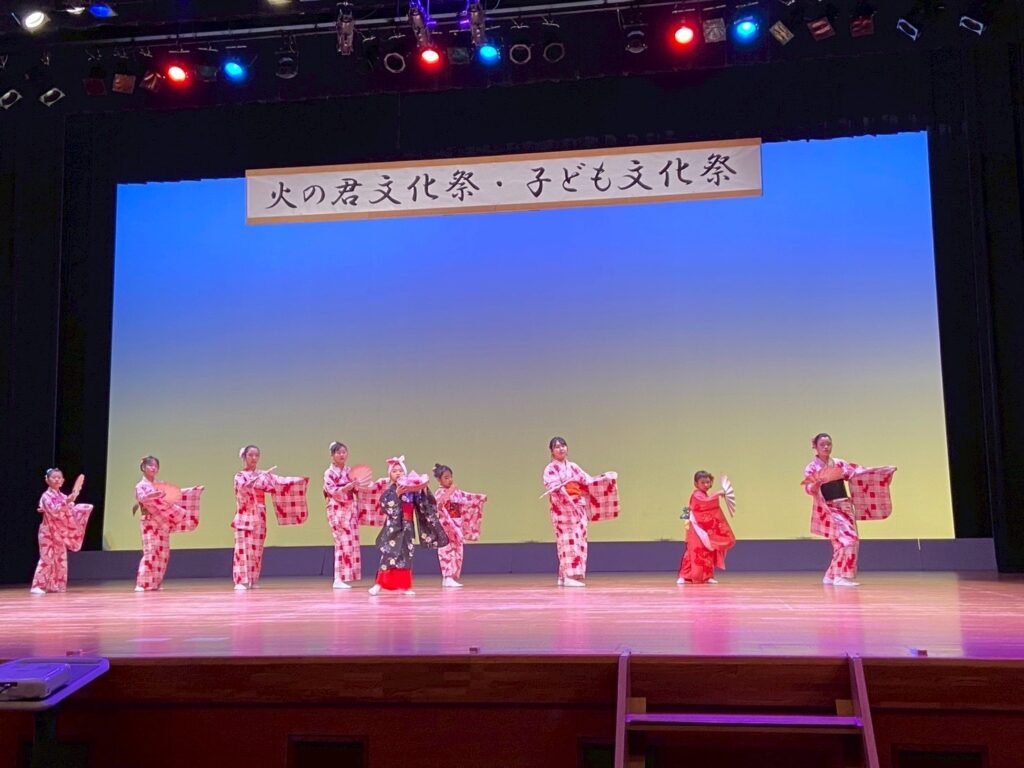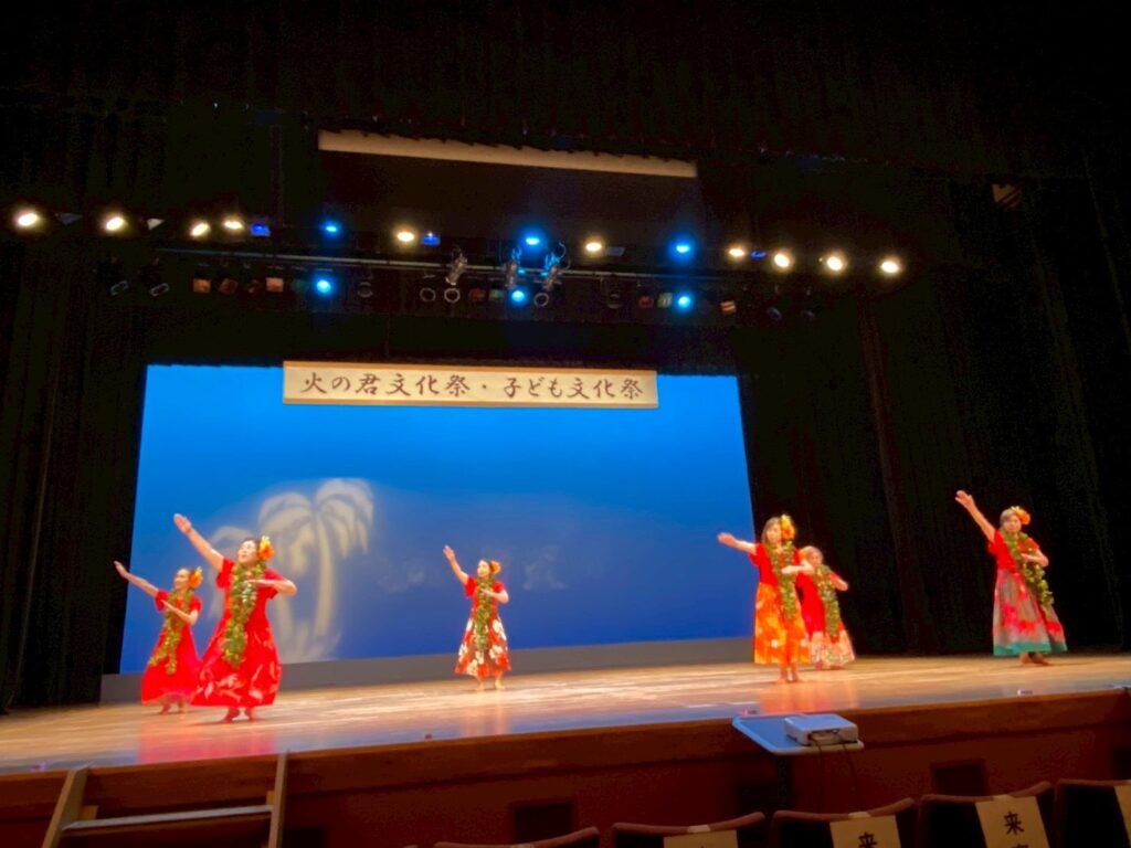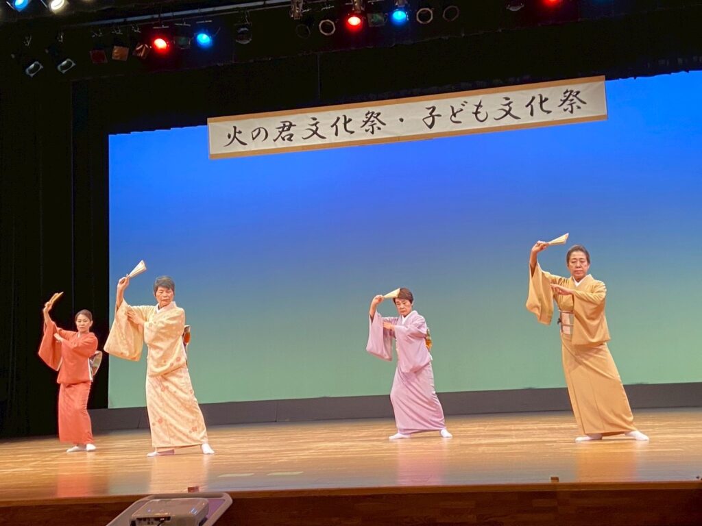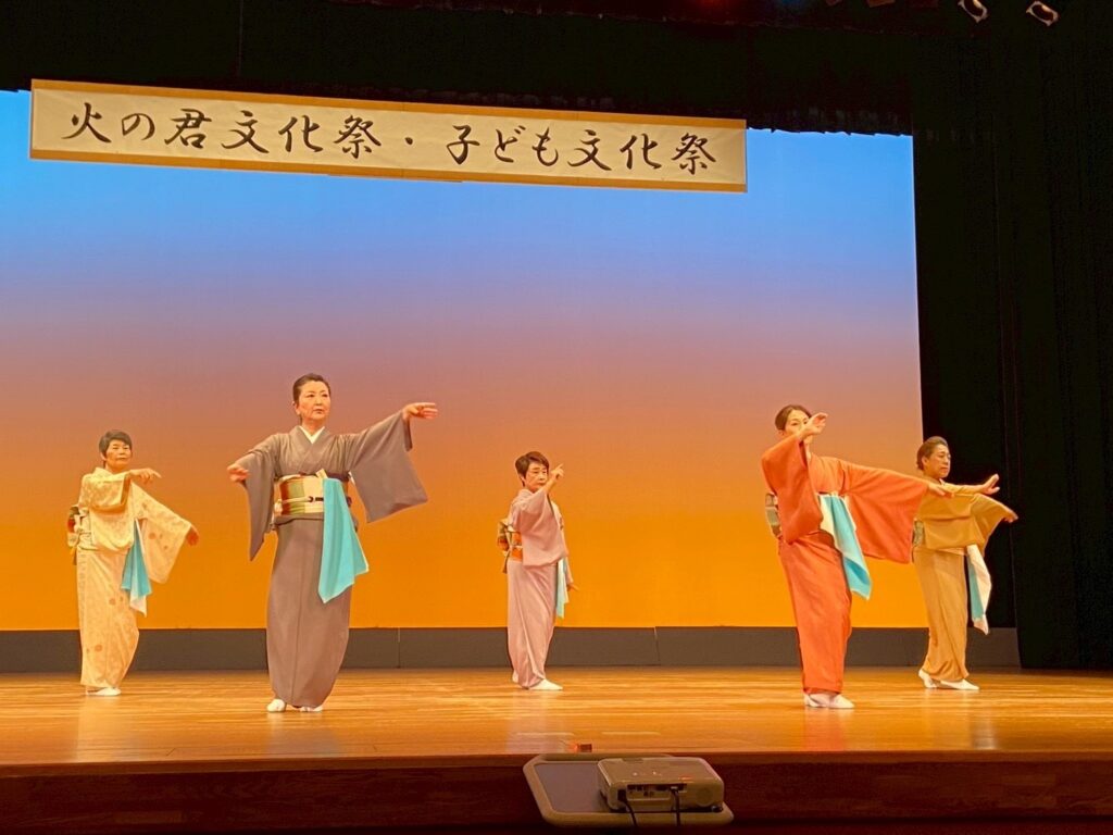 ステージ発表では、子ども文化祭として、保育園、こども園、幼稚園、小学校の園児・児童による合唱・器楽演奏・日舞・ダンスなど、火の君文化祭として、フラダンス・合唱・ギター・ウクレレ・フルート・ハーモニカ・大正琴・レクダンス・民謡・日舞・尺八・オカリナ・民話・創作ダンス・吟詠・サックスなど合計48組のパフォーマンスがありました。