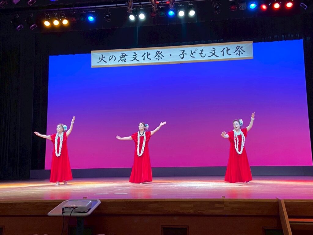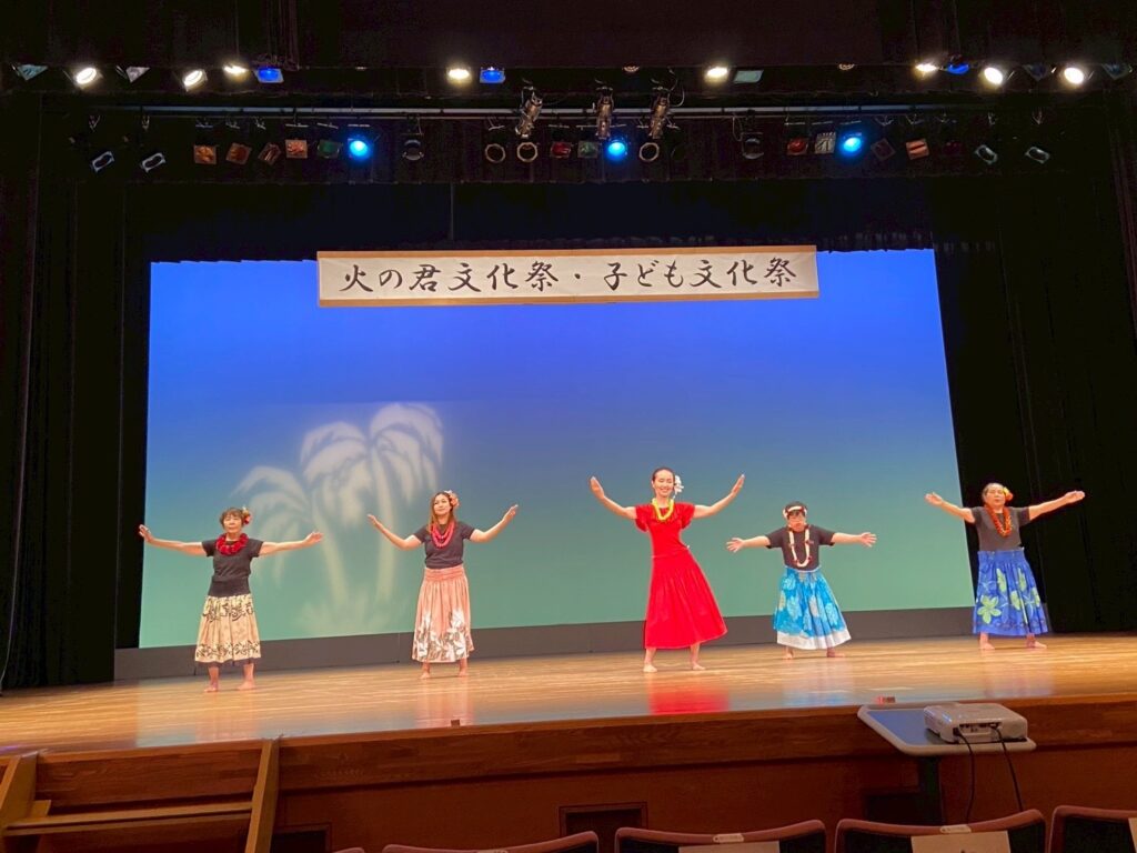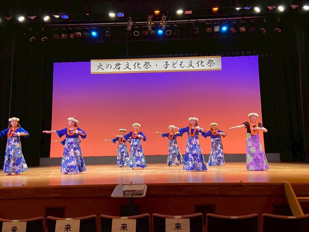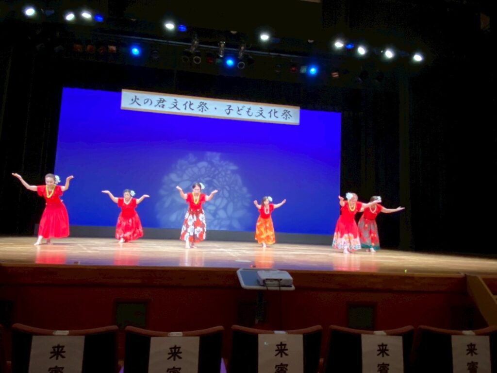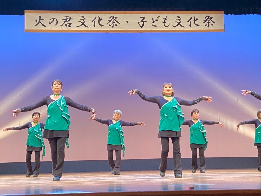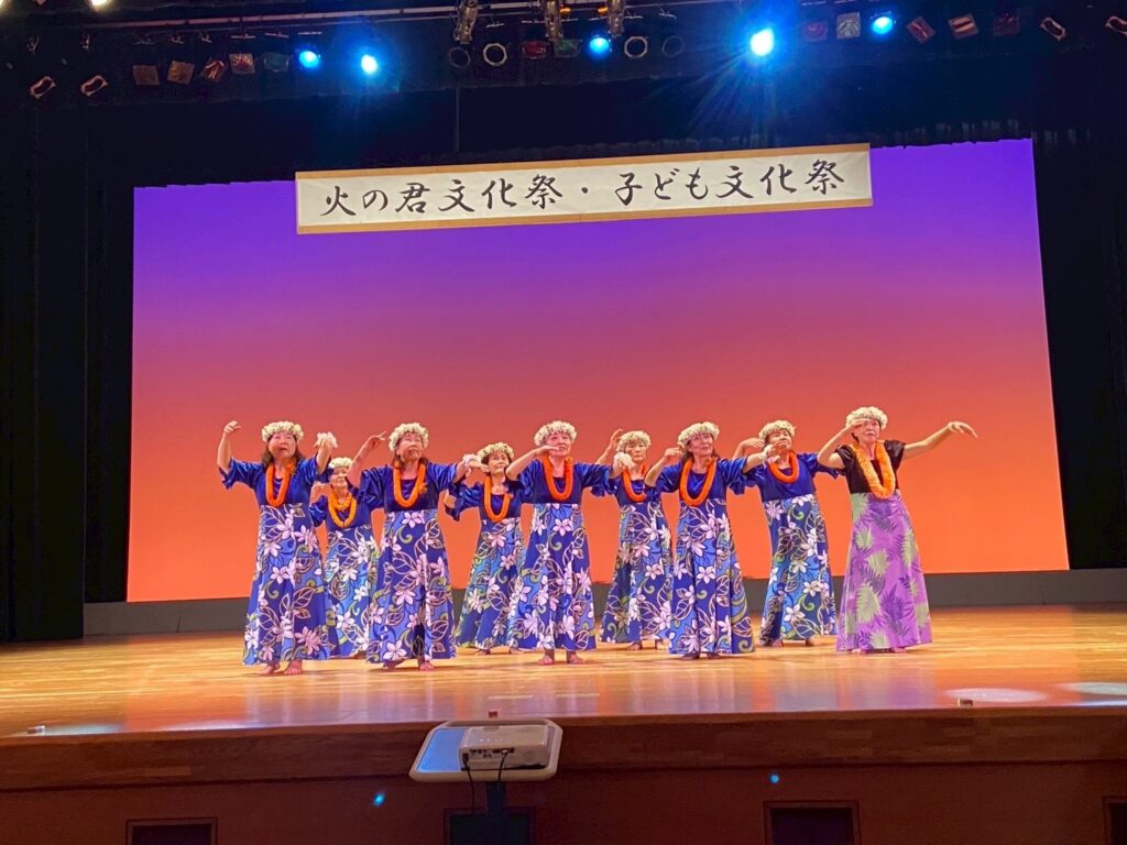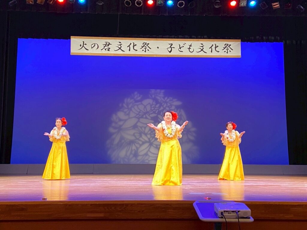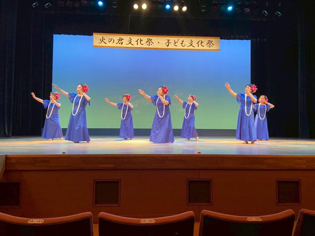 ステージ発表では、子ども文化祭として、保育園、こども園、幼稚園、小学校の園児・児童による合唱・器楽演奏・日舞・ダンスなど、火の君文化祭として、フラダンス・合唱・ギター・ウクレレ・フルート・ハーモニカ・大正琴・レクダンス・民謡・日舞・尺八・オカリナ・民話・創作ダンス・吟詠・サックスなど合計48組のパフォーマンスがありました。