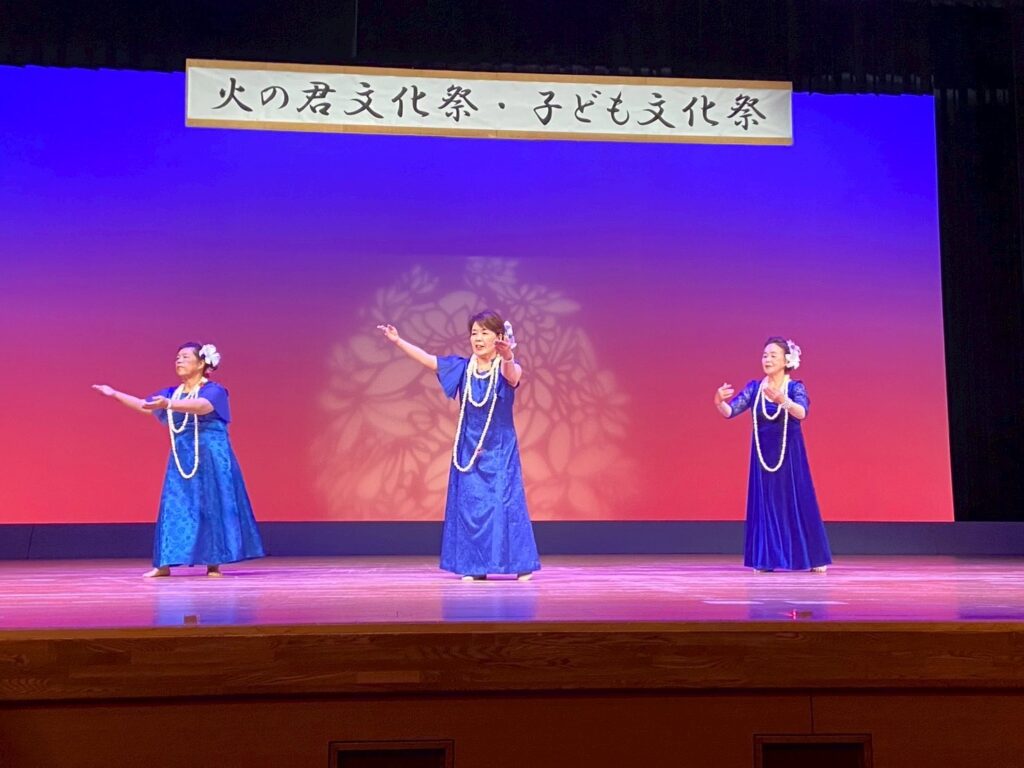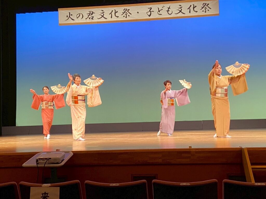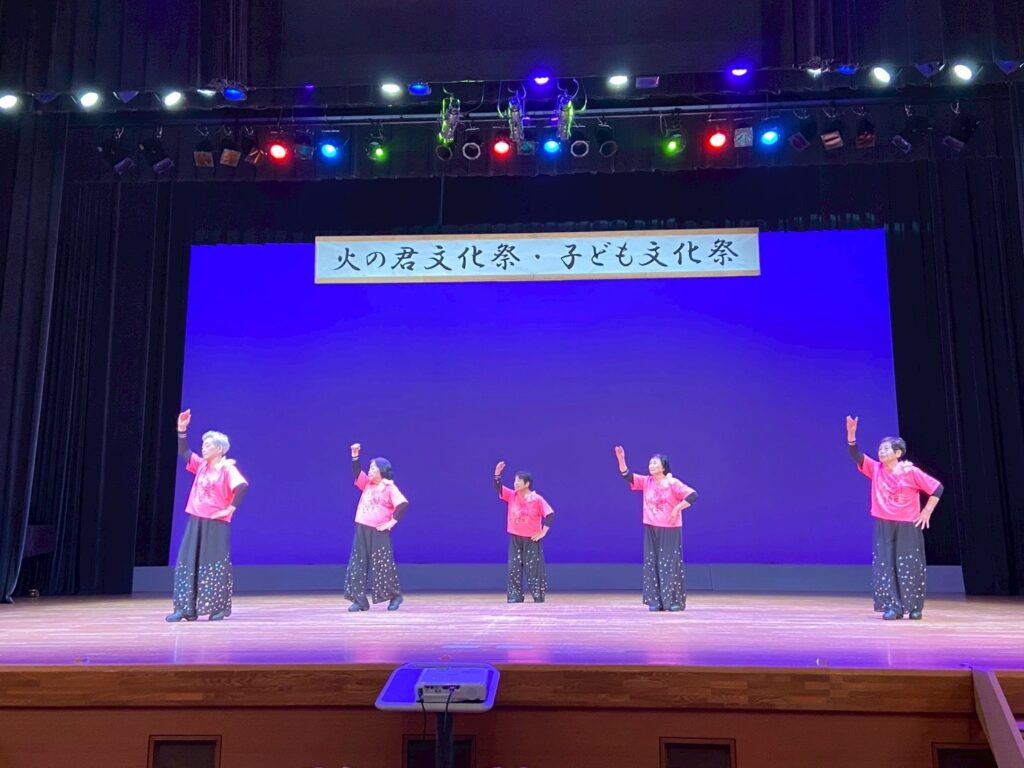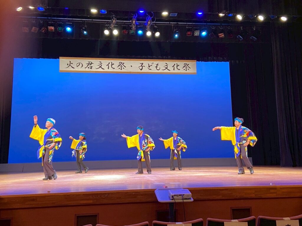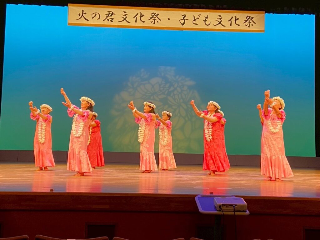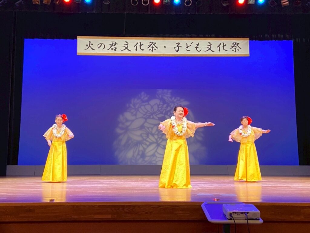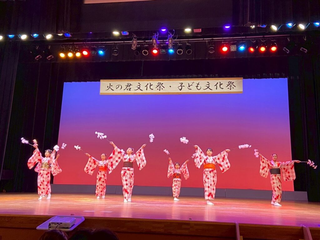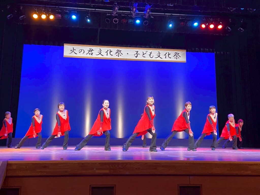ステージ発表では、子ども文化祭として、保育園、こども園、幼稚園、小学校の園児・児童による合唱・器楽演奏・日舞・ダンスなど、火の君文化祭として、フラダンス・合唱・ギター・ウクレレ・フルート・ハーモニカ・大正琴・レクダンス・民謡・日舞・尺八・オカリナ・民話・創作ダンス・吟詠・サックスなど合計48組のパフォーマンスがありました。
