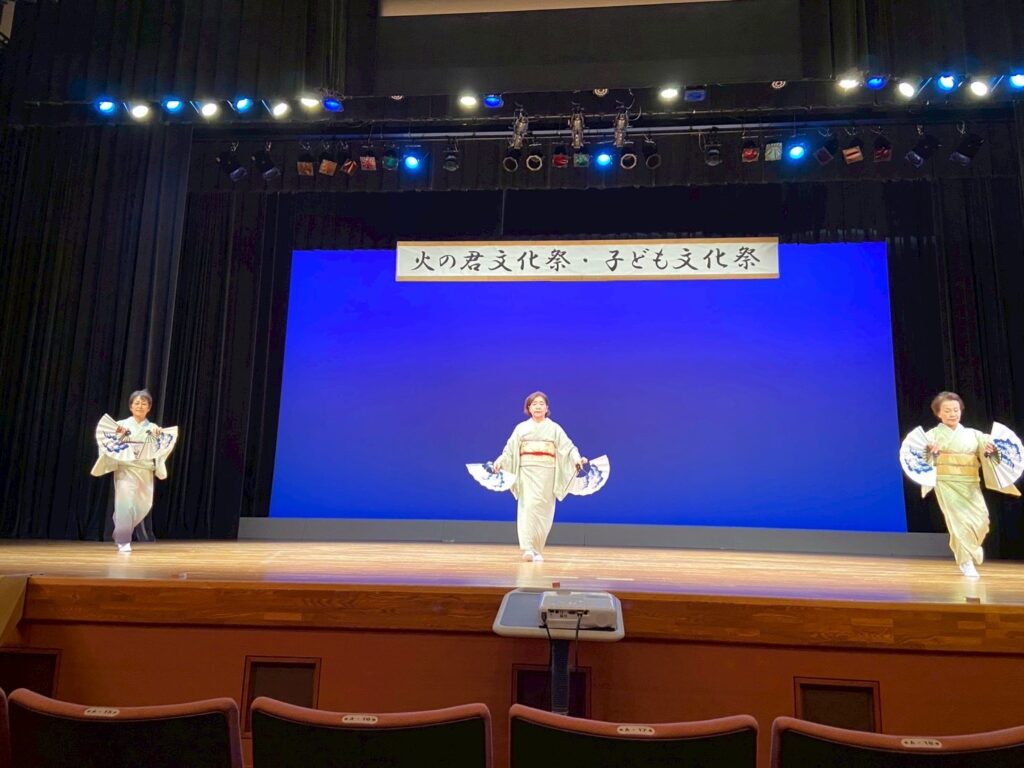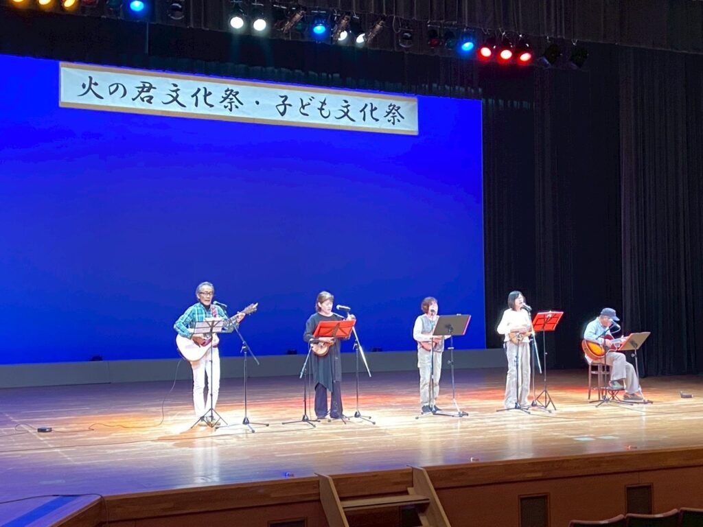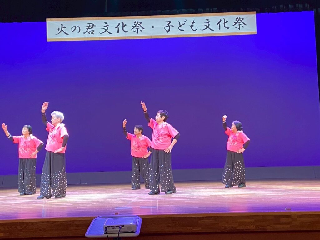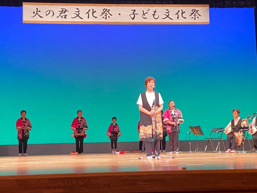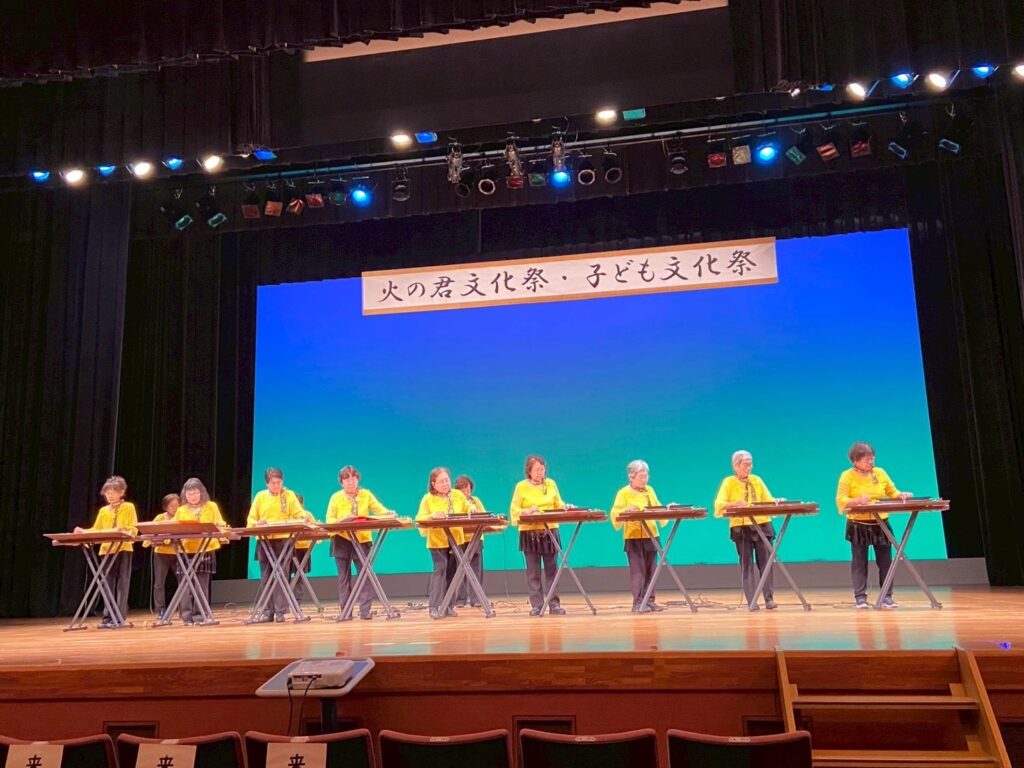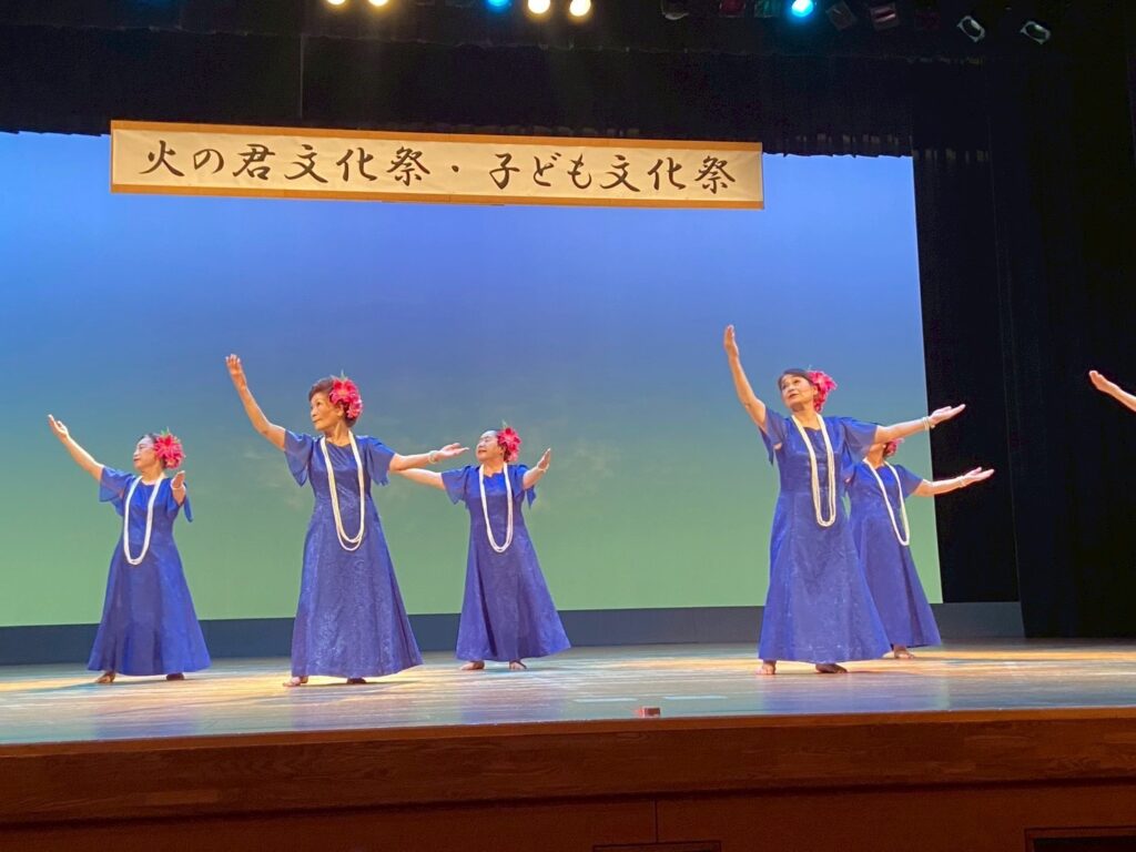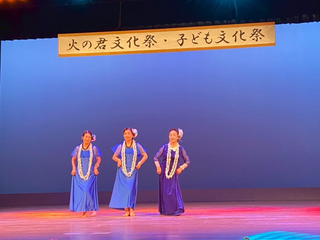 ステージ発表では、子ども文化祭として、保育園、こども園、幼稚園、小学校の園児・児童による合唱・器楽演奏・日舞・ダンスなど、火の君文化祭として、フラダンス・合唱・ギター・ウクレレ・フルート・ハーモニカ・大正琴・レクダンス・民謡・日舞・尺八・オカリナ・民話・創作ダンス・吟詠・サックスなど合計48組のパフォーマンスがありました。
