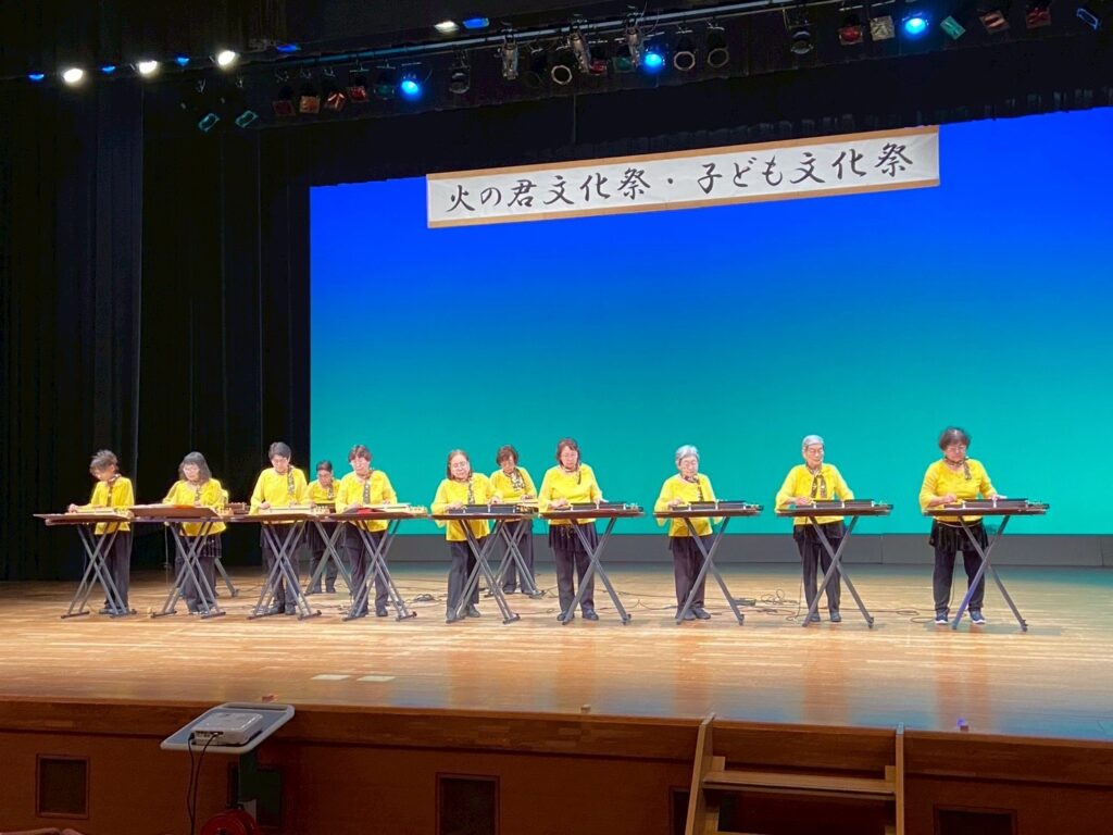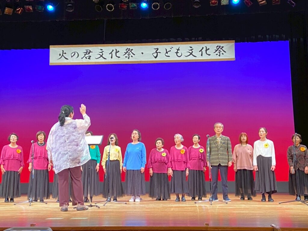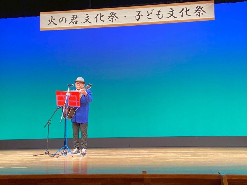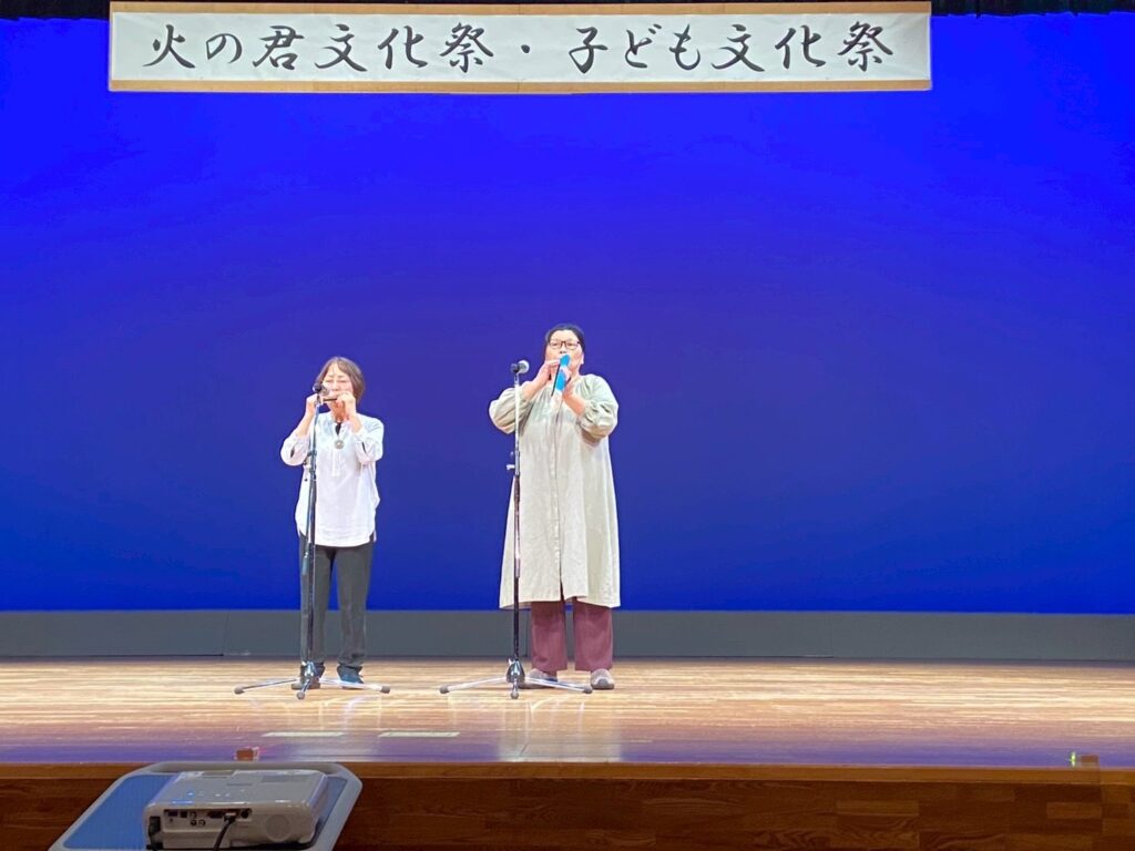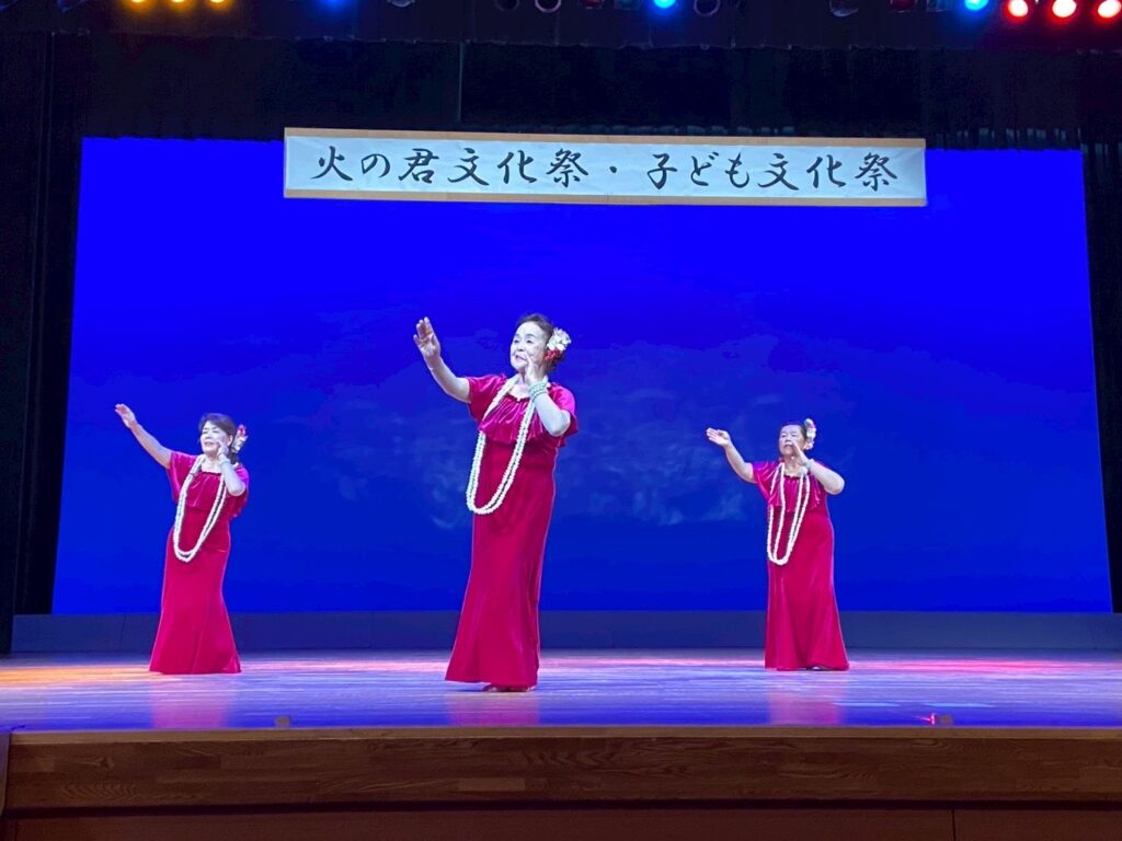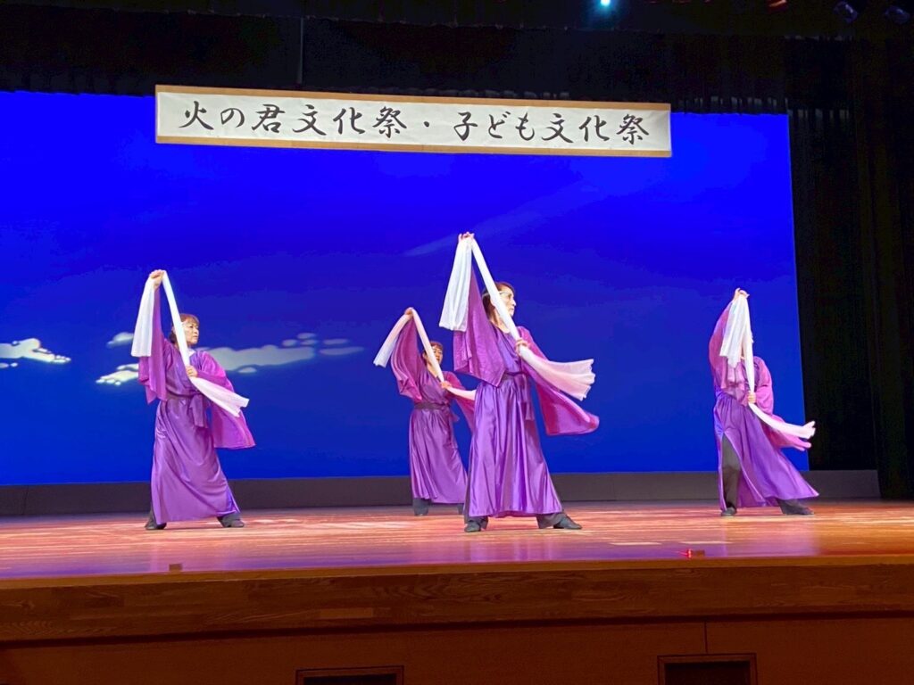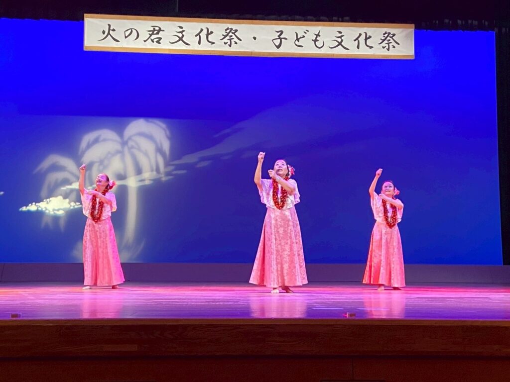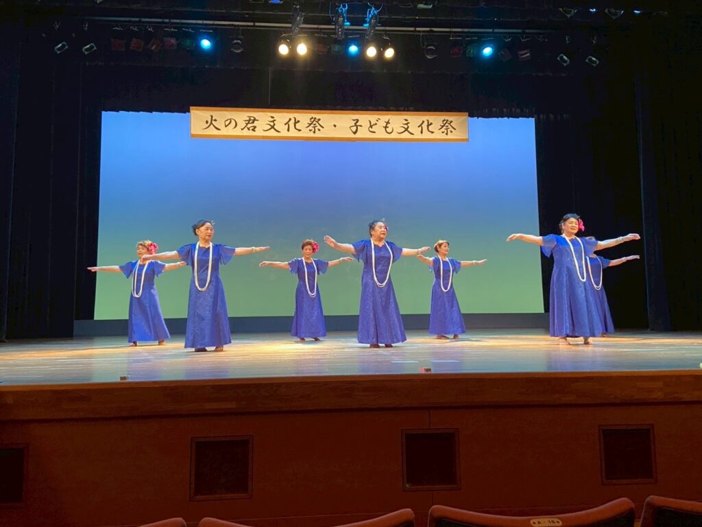 ステージ発表では、子ども文化祭として、保育園、こども園、幼稚園、小学校の園児・児童による合唱・器楽演奏・日舞・ダンスなど、火の君文化祭として、フラダンス・合唱・ギター・ウクレレ・フルート・ハーモニカ・大正琴・レクダンス・民謡・日舞・尺八・オカリナ・民話・創作ダンス・吟詠・サックスなど合計48組のパフォーマンスがありました。