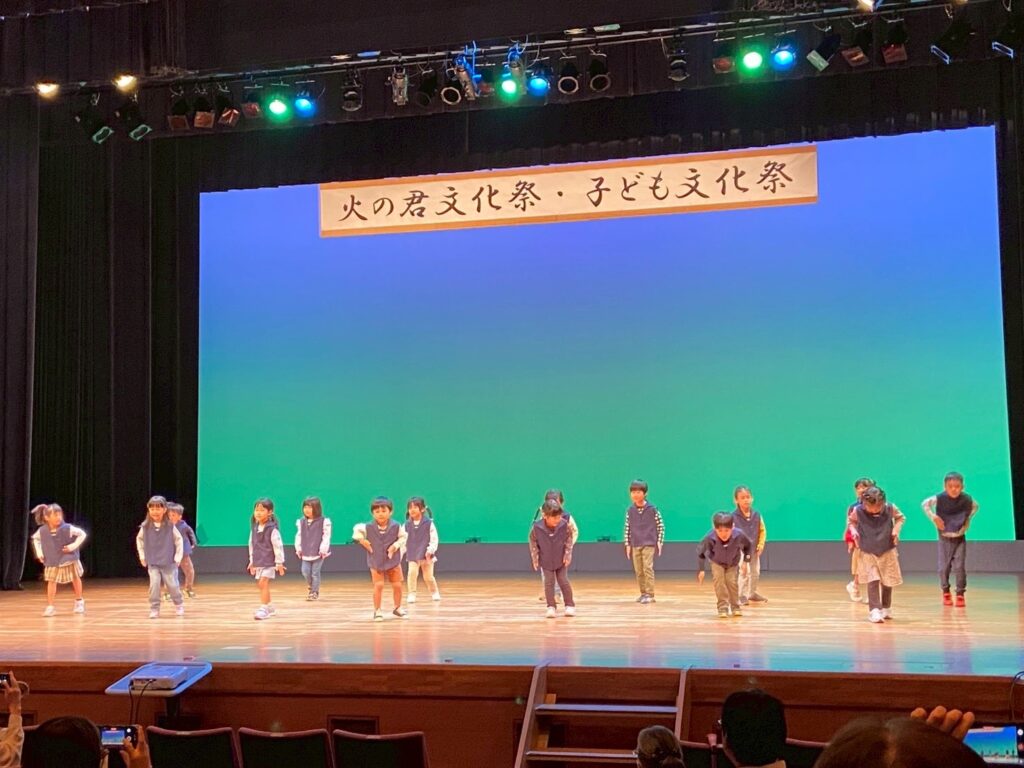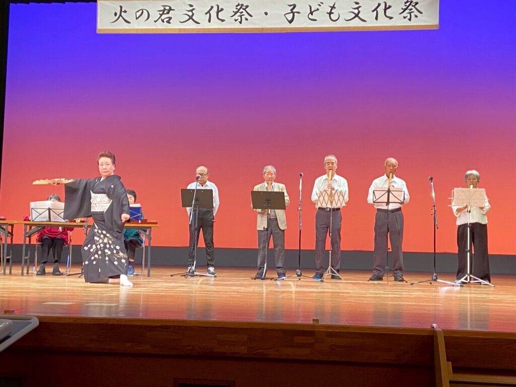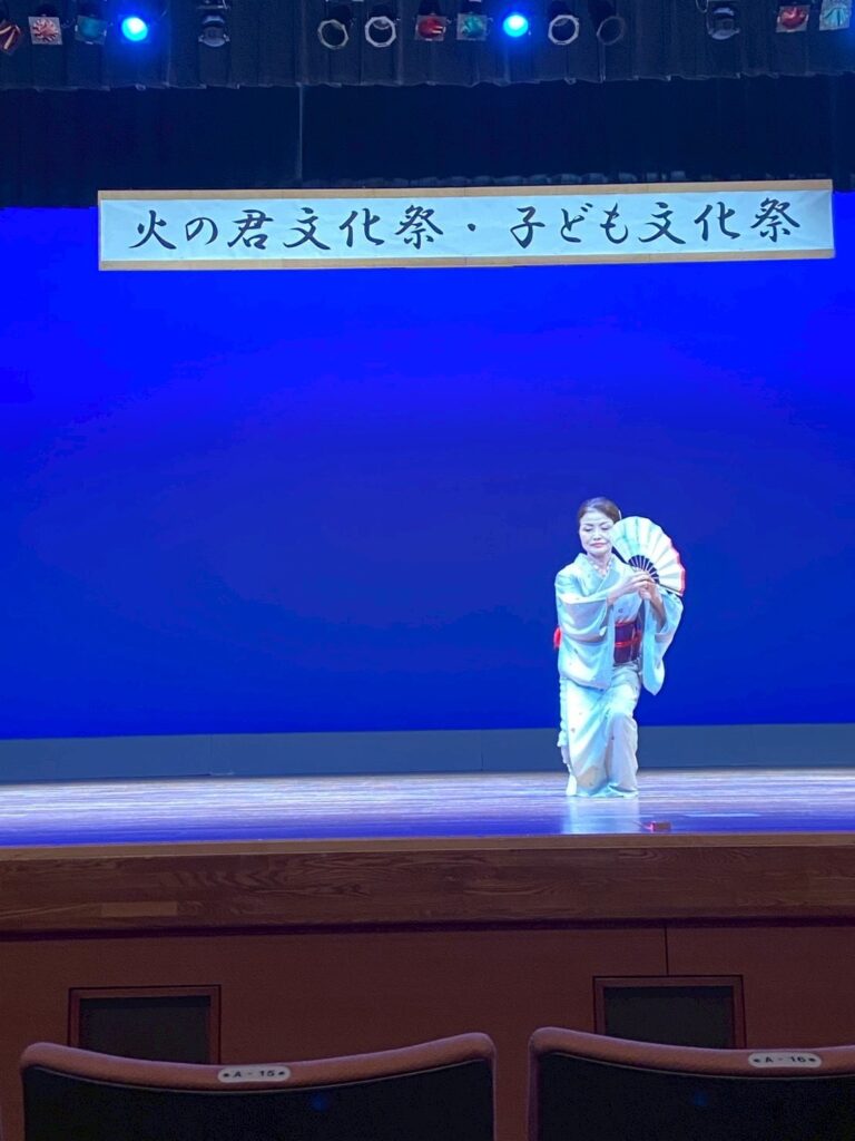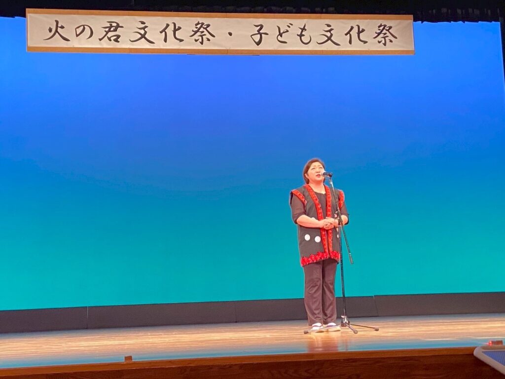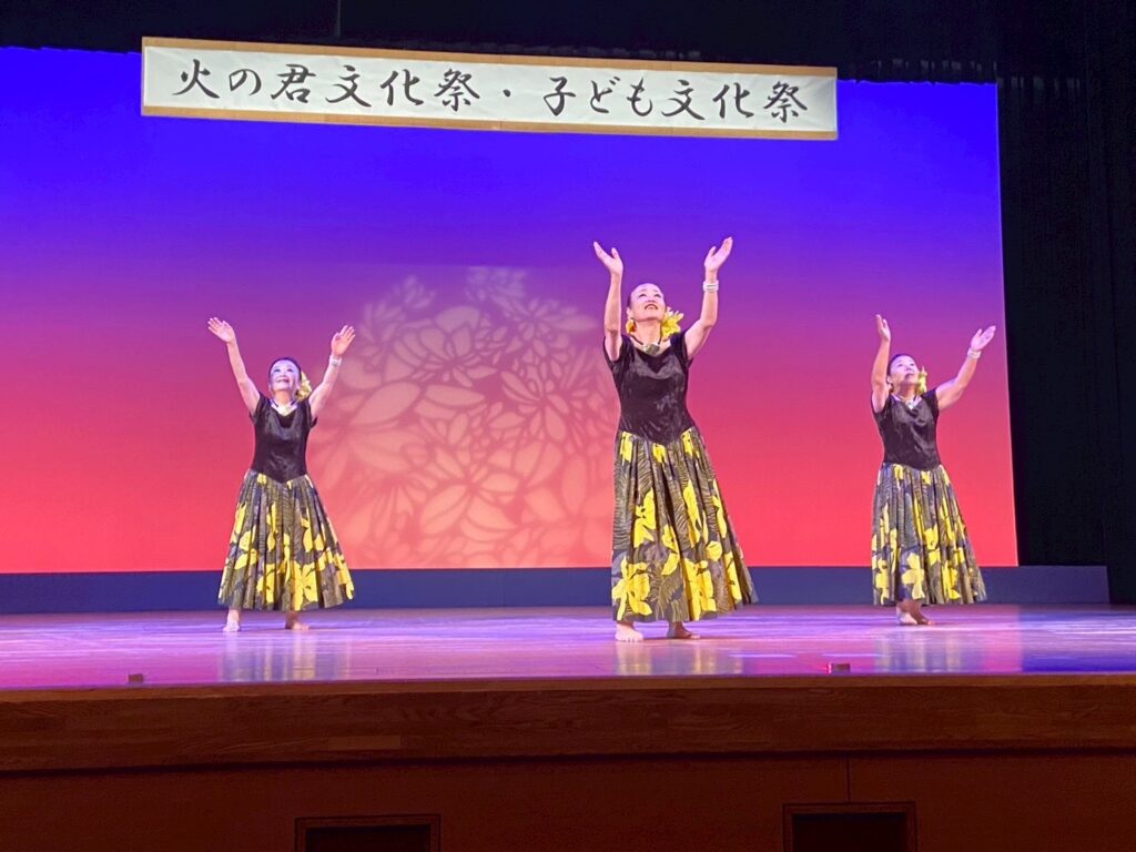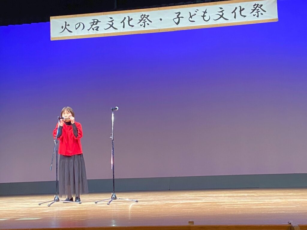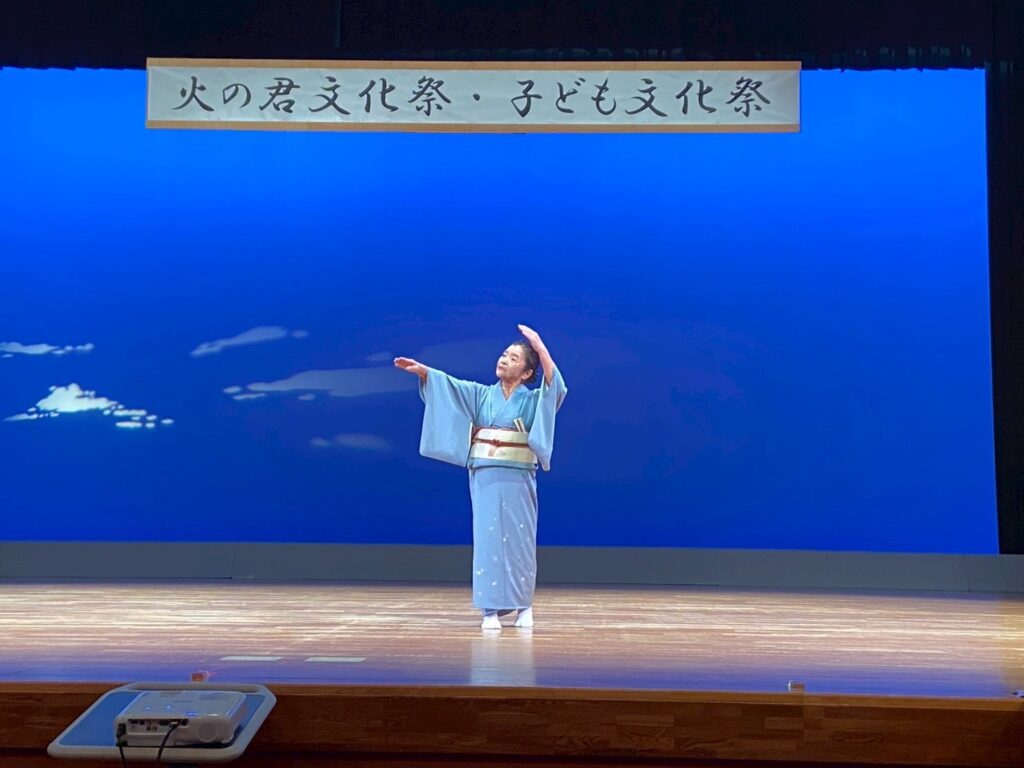 ステージ発表では、子ども文化祭として、保育園、こども園、幼稚園、小学校の園児・児童による合唱・器楽演奏・日舞・ダンスなど、火の君文化祭として、フラダンス・合唱・ギター・ウクレレ・フルート・ハーモニカ・大正琴・レクダンス・民謡・日舞・尺八・オカリナ・民話・創作ダンス・吟詠・サックスなど合計48組のパフォーマンスがありました。
