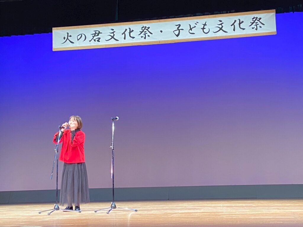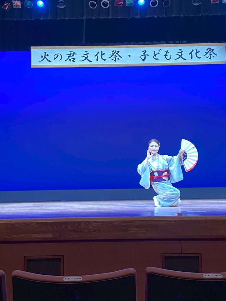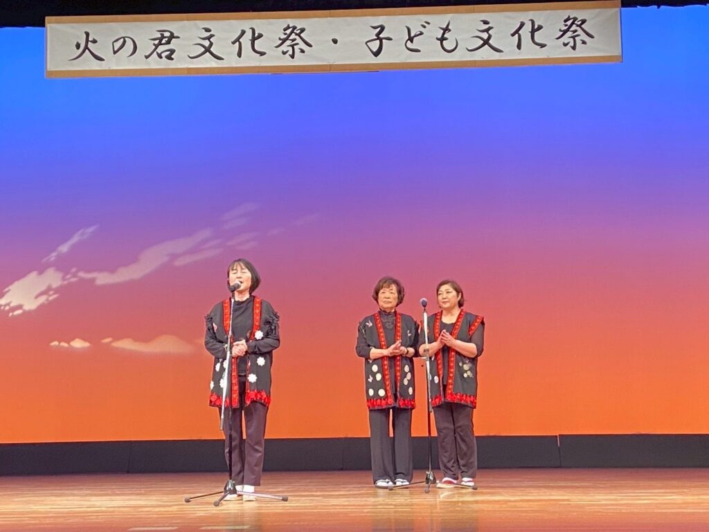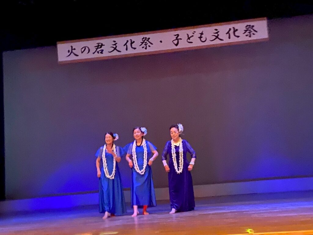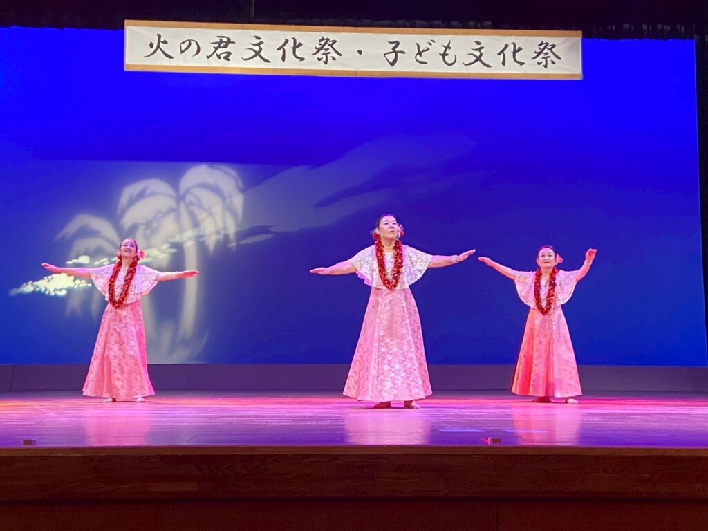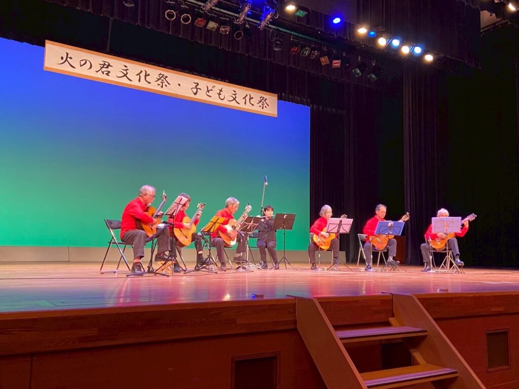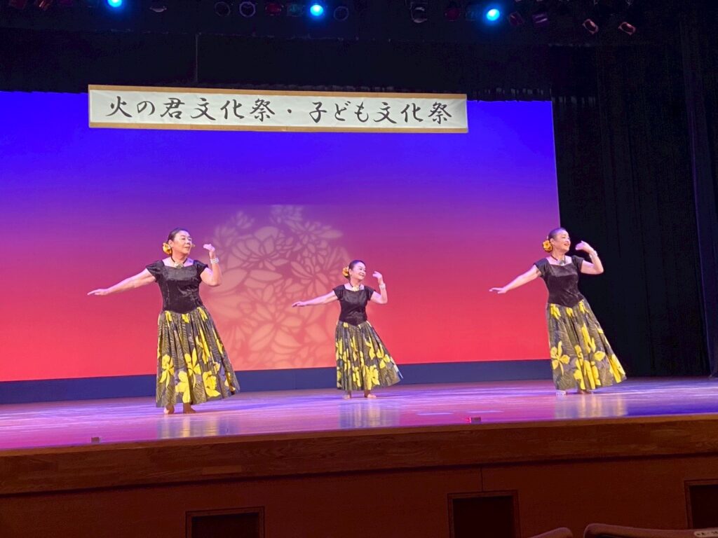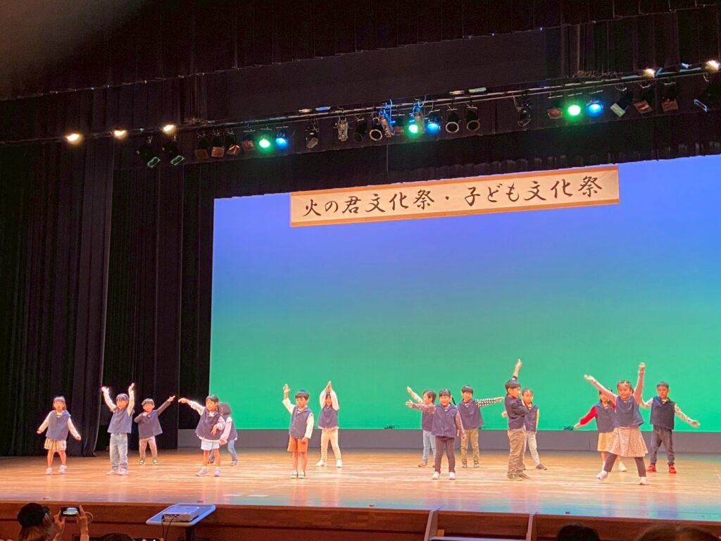 ステージ発表では、子ども文化祭として、保育園、こども園、幼稚園、小学校の園児・児童による合唱・器楽演奏・日舞・ダンスなど、火の君文化祭として、フラダンス・合唱・ギター・ウクレレ・フルート・ハーモニカ・大正琴・レクダンス・民謡・日舞・尺八・オカリナ・民話・創作ダンス・吟詠・サックスなど合計48組のパフォーマンスがありました。