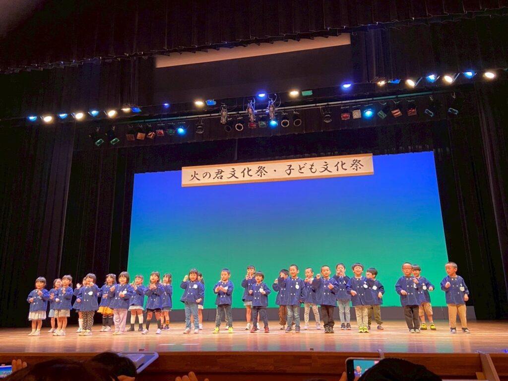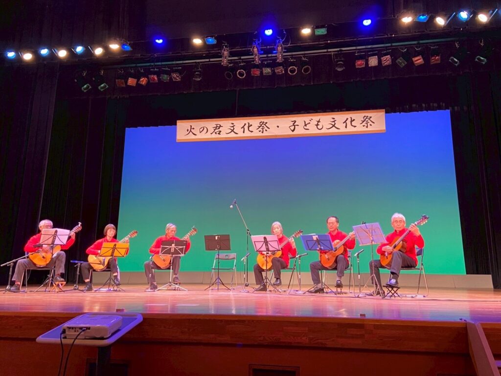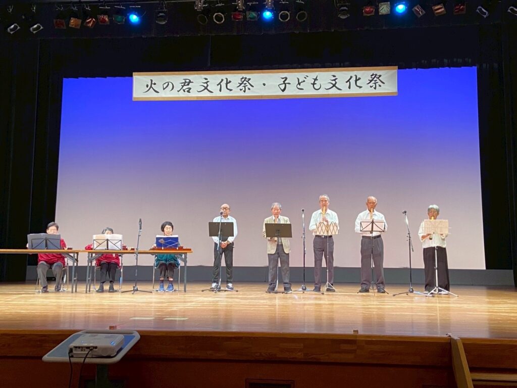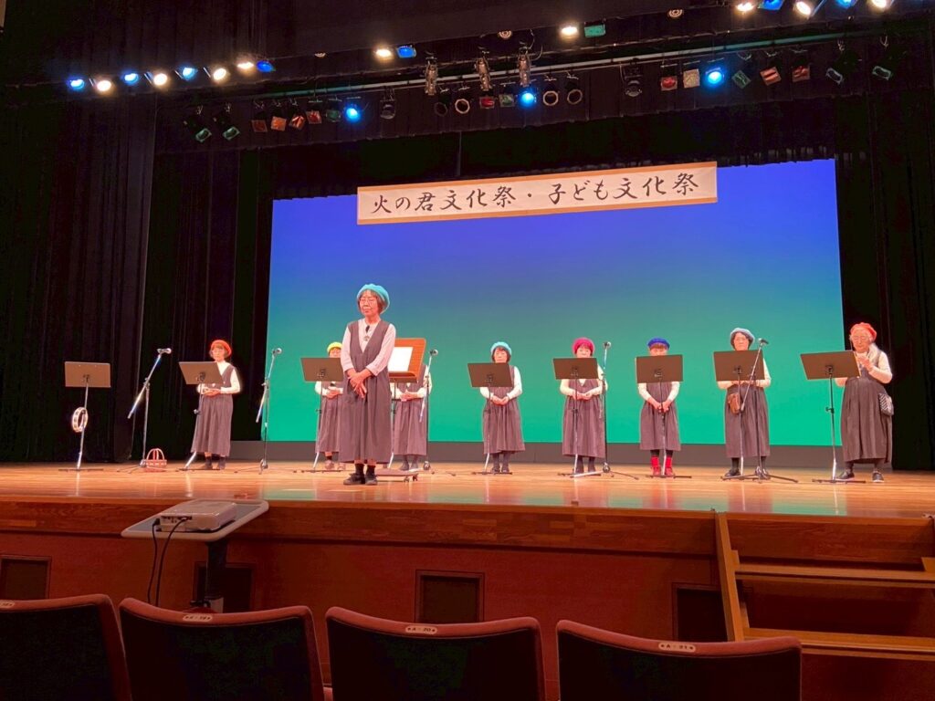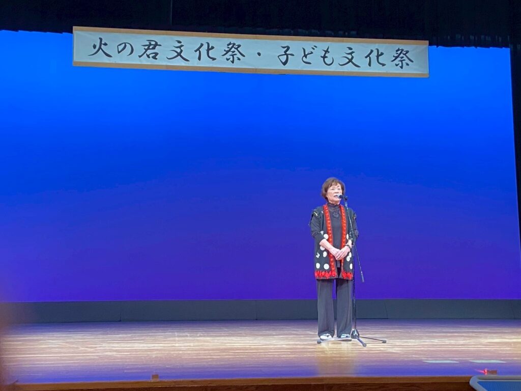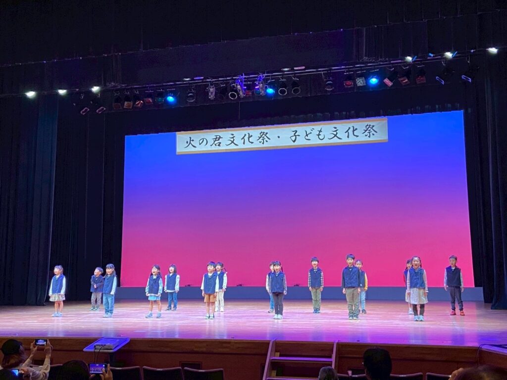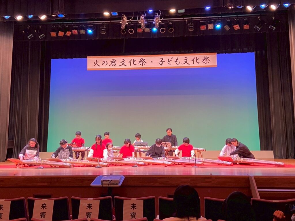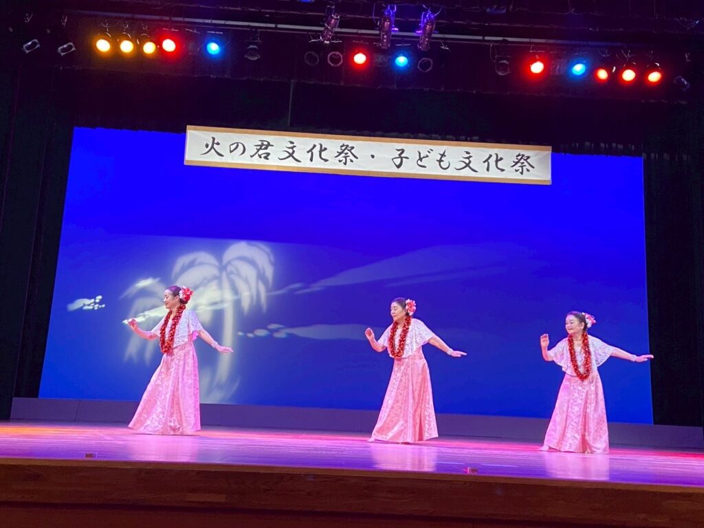 ステージ発表では、子ども文化祭として、保育園、こども園、幼稚園、小学校の園児・児童による合唱・器楽演奏・日舞・ダンスなど、火の君文化祭として、フラダンス・合唱・ギター・ウクレレ・フルート・ハーモニカ・大正琴・レクダンス・民謡・日舞・尺八・オカリナ・民話・創作ダンス・吟詠・サックスなど合計48組のパフォーマンスがありました。