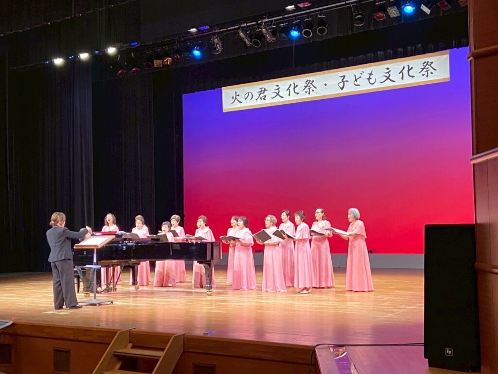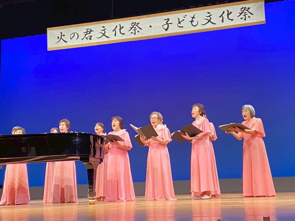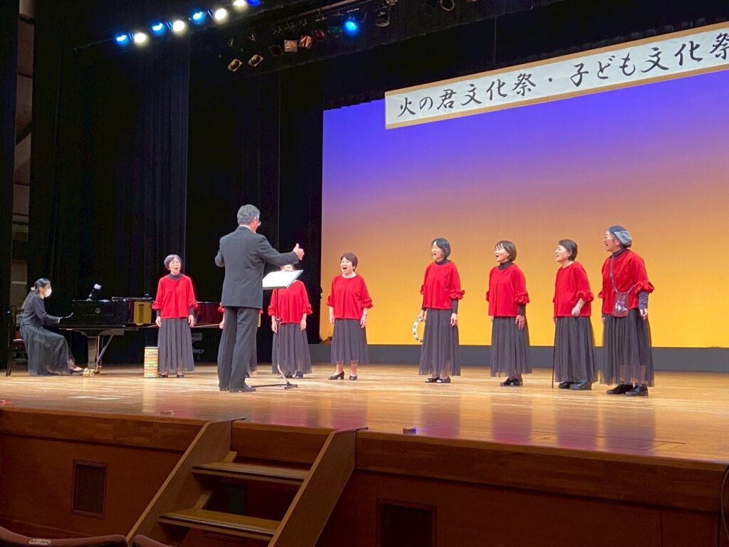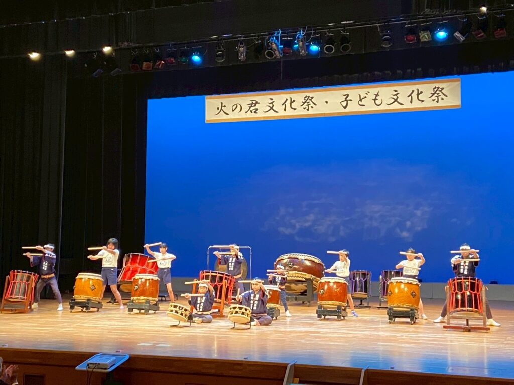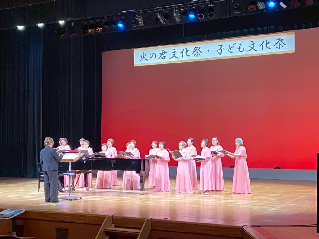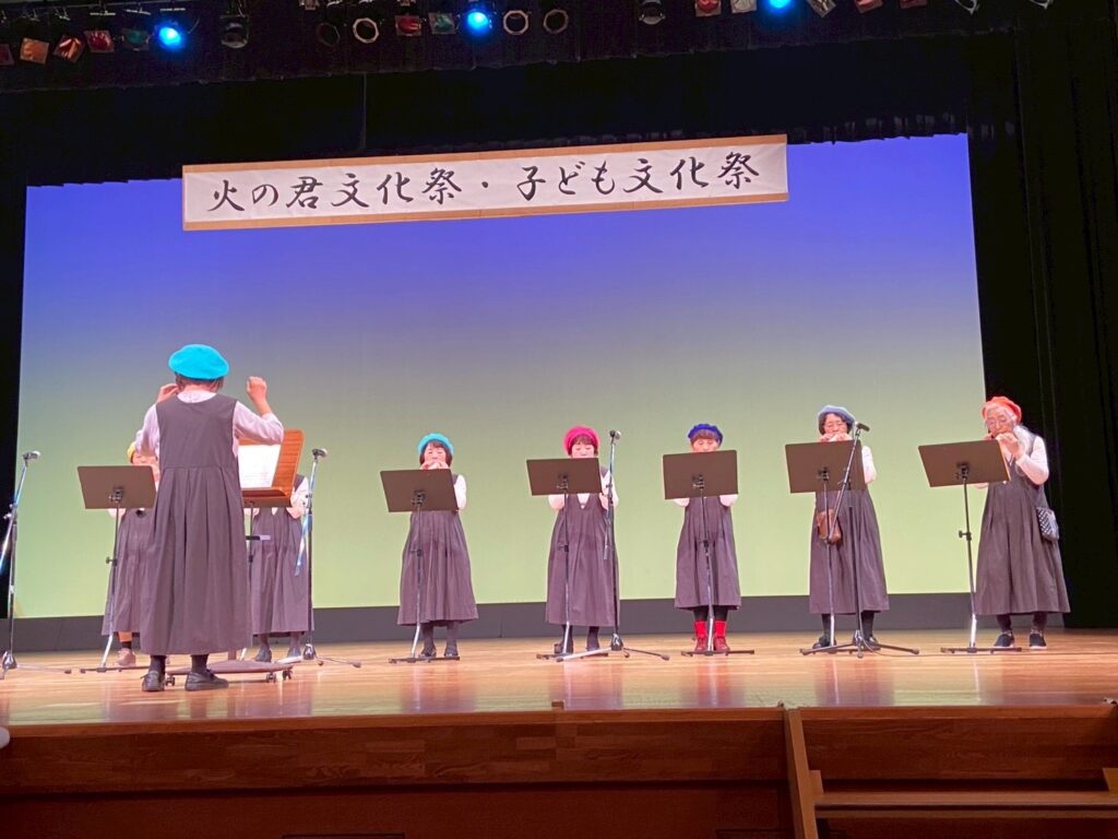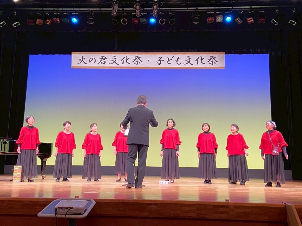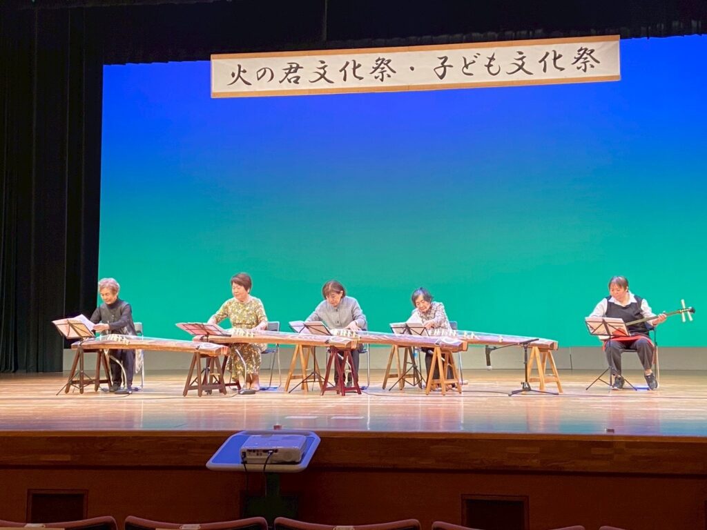 ステージ発表では、子ども文化祭として、保育園、こども園、幼稚園、小学校の園児・児童による合唱・器楽演奏・日舞・ダンスなど、火の君文化祭として、フラダンス・合唱・ギター・ウクレレ・フルート・ハーモニカ・大正琴・レクダンス・民謡・日舞・尺八・オカリナ・民話・創作ダンス・吟詠・サックスなど合計48組のパフォーマンスがありました。